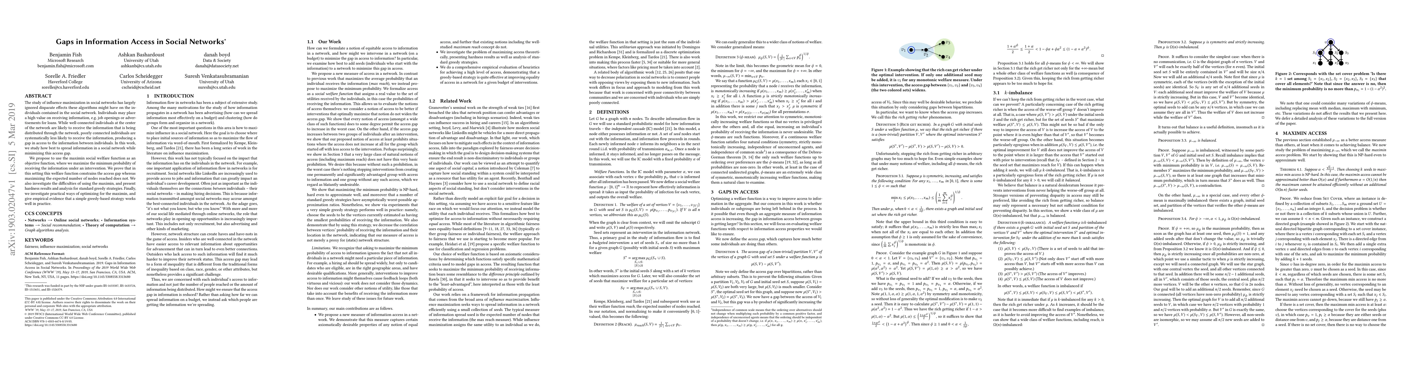 This paper examines the disparity in information access within social networks, proposing the maximin social welfare function to minimize the gap in information reach. It demonstrates that while traditional methods maximize reach, they exacerbate access inequality, whereas the proposed method effectively constrains this disparity.