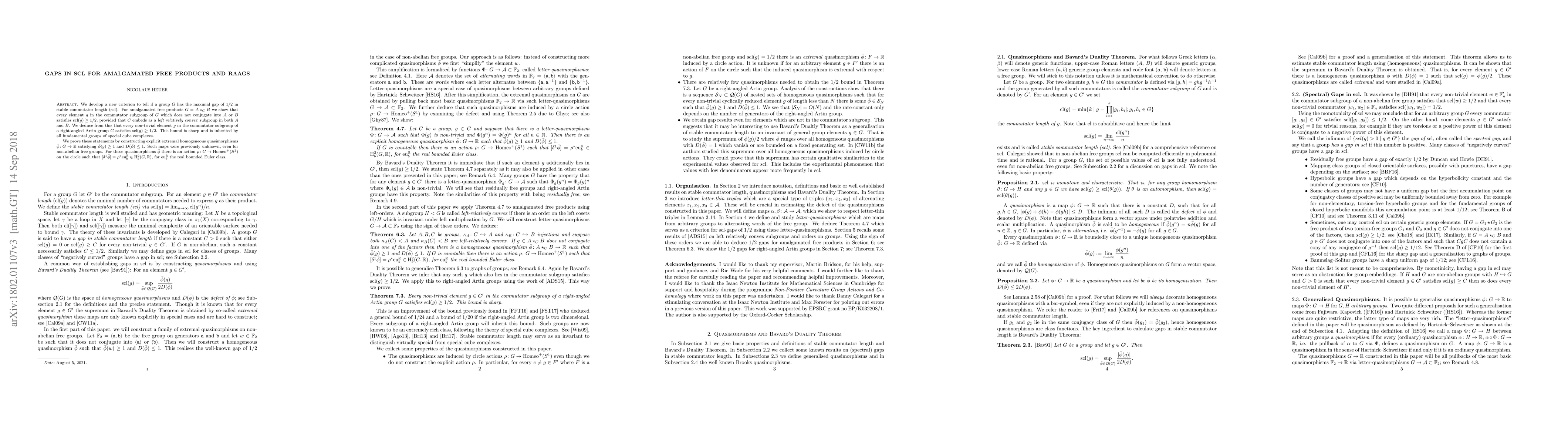 We develop a new criterion to tell if a group $G$ has the maximal gap of $1/2$ in stable commutator length (scl). For amalgamated free products $G = A \star_C B$ we show that every element $g$ in the commutator subgroup of $G$ which does not conjugate into $A$ or $B$ satisfies $scl(g) \geq 1/2$, provided that $C$ embeds as a left relatively convex subgroup in both $A$ and $B$. We deduce from this that every non-trivial element $g$ in the commutator subgroup of a right-angled Artin group $G$ satisfies $scl(g) \geq 1/2$. This bound is sharp and is inherited by all fundamental groups of special cube complexes. We prove these statements by constructing explicit extremal homogeneous quasimorphisms $\bar{ \phi} : G \to \mathbb{R}$ satisfying $\bar{ \phi }(g) \geq 1$ and $D(\bar{\phi})\leq 1$. Such maps were previously unknown, even for non-abelian free groups. For these quasimorphisms $\bar{\phi}$ there is an action $\rho : G \to Homeo^+(S^1)$ on the circle such that $[\delta^1 \bar{ \phi}]=\rho^*eu^{\mathbb{R}}_b \in H^2_b(G,\mathbb{R})$, for $eu^\mathbb{R}_b$ the real bounded Euler class.