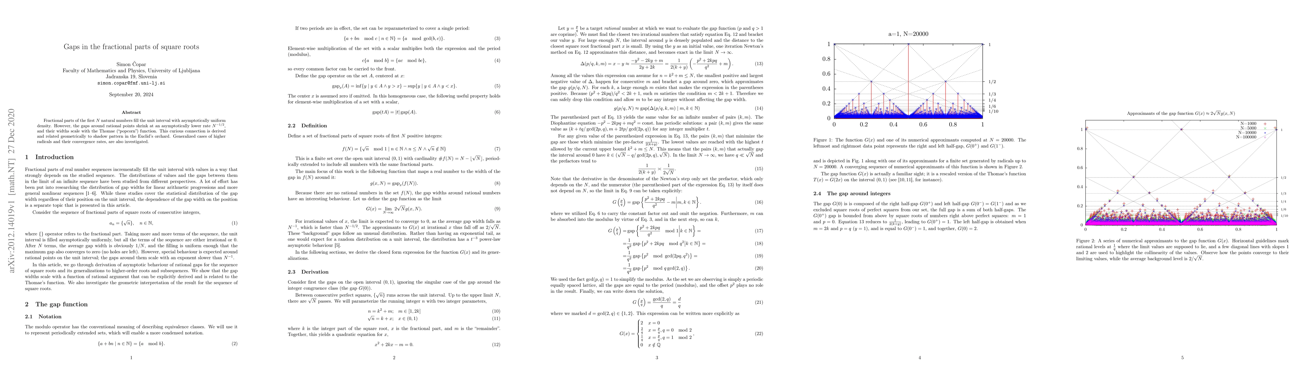 Fractional parts of the first $N$ natural numbers fill the unit interval with asymptotically uniform density. However, the gaps around rational points shrink at an asymptotically lower rate $N^{-1/2}$, and their widths scale with the Thomae ("popcorn") function. This curious connection is derived and related geometrically to shadow pattern in the Euclid's orchard. Generalized cases of higher radicals and their convergence rates, are also investigated.