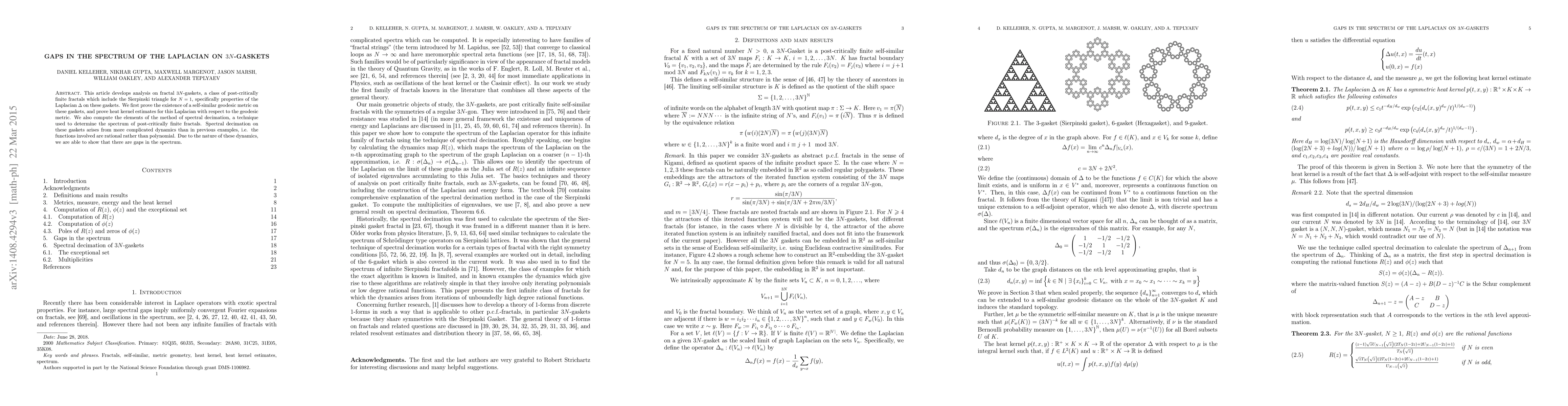 This research paper analyzes the Laplacian on fractal 3N-gaskets, proving the existence of a self-similar geodesic metric and heat kernel estimates. It employs the spectral decimation method to uncover gaps in the spectrum, revealing more complex dynamics due to rational functions involved, compared to previous polynomial examples.