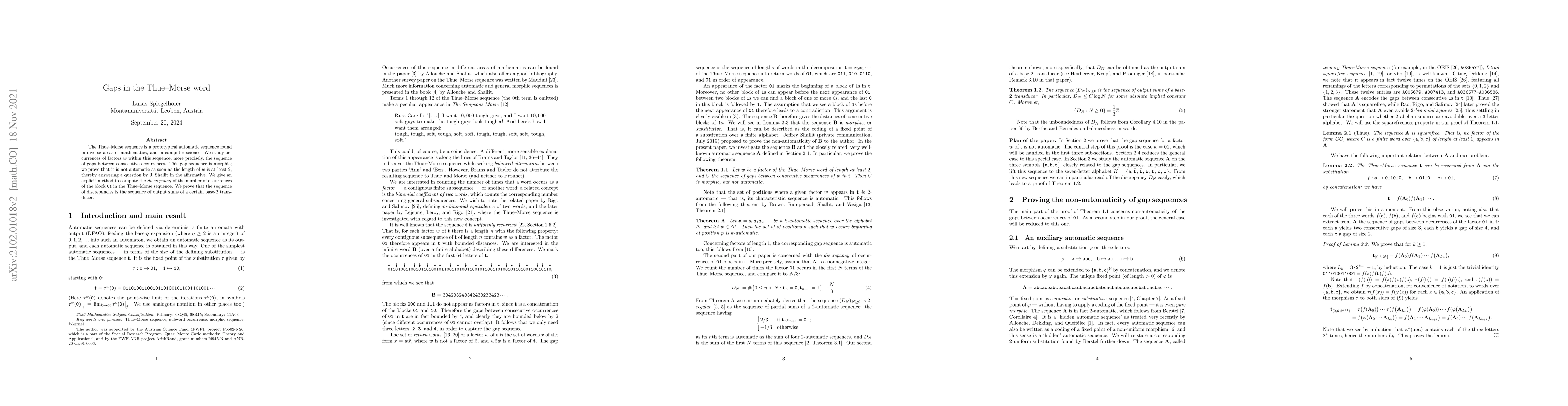 The paper investigates the Thue--Morse sequence, focusing on the gaps between consecutive occurrences of factors, proving that the resulting gap sequence is morphic but not automatic for factors of length at least two. It also provides an explicit method to compute the discrepancy of the block "01" occurrences and shows that the sequence of discrepancies corresponds to the output sums of a specific base-2 transducer.