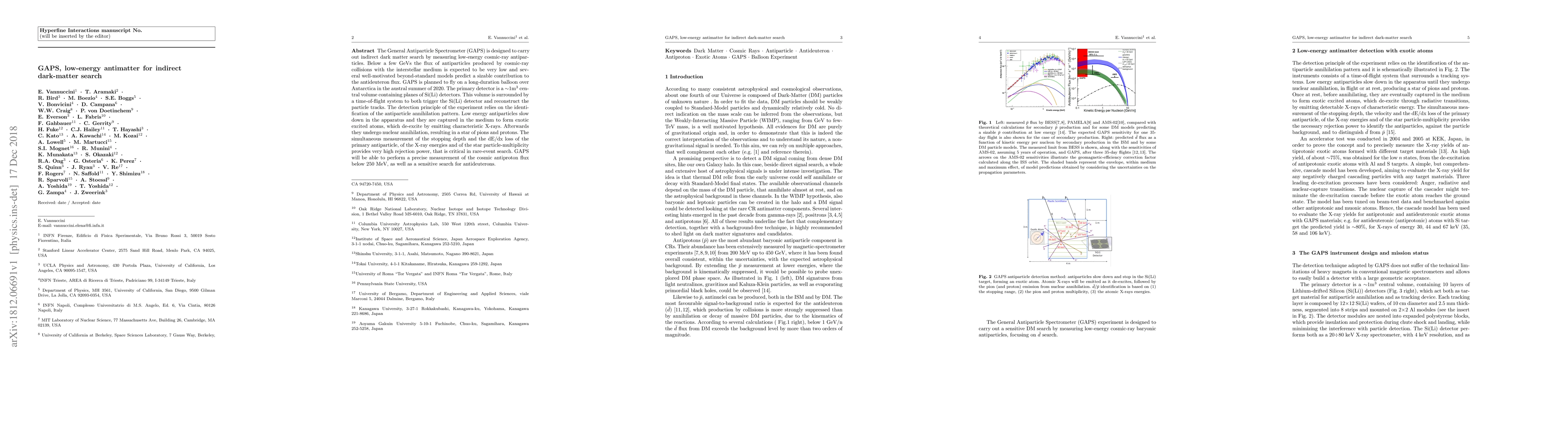 The General Antiparticle Spectrometer (GAPS) aims to detect low-energy cosmic-ray antiparticles for indirect dark matter search, utilizing a 1m³ Si(Li) detector surrounded by a time-of-flight system. The experiment identifies antiparticles through their annihilation pattern, measuring X-rays and particle multiplicity for precise flux measurements and antideuteron detection.