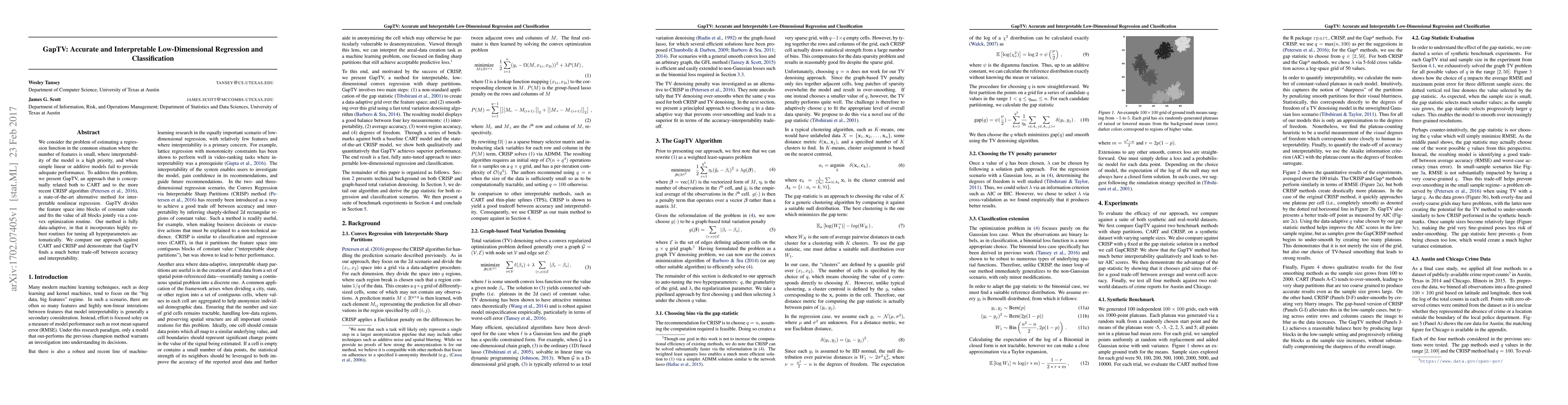 GapTV offers an innovative approach for low-dimensional regression and classification by dividing the feature space into constant value blocks and fitting them jointly via convex optimization. It achieves a superior balance between accuracy and interpretability compared to CART and CRISP, while automatically tuning hyperparameters for data-adaptive performance.