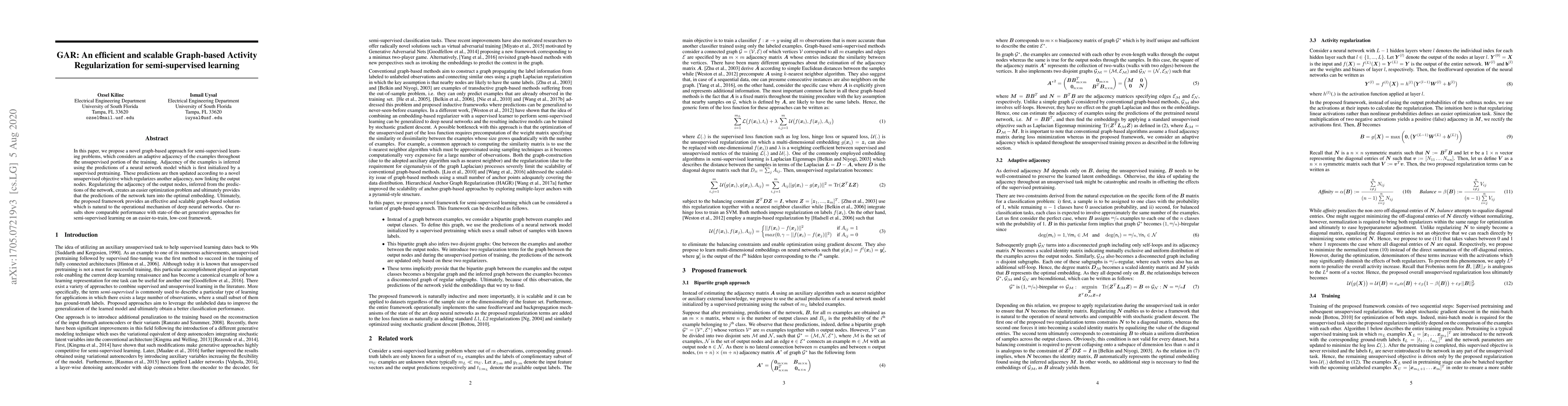 This paper introduces GAR, a scalable graph-based activity regularization method for semi-supervised learning that leverages neural network predictions to adaptively infer example adjacency. The approach optimizes the network's predictions through regularization of output node adjacency, achieving competitive performance with generative methods in a low-cost framework.