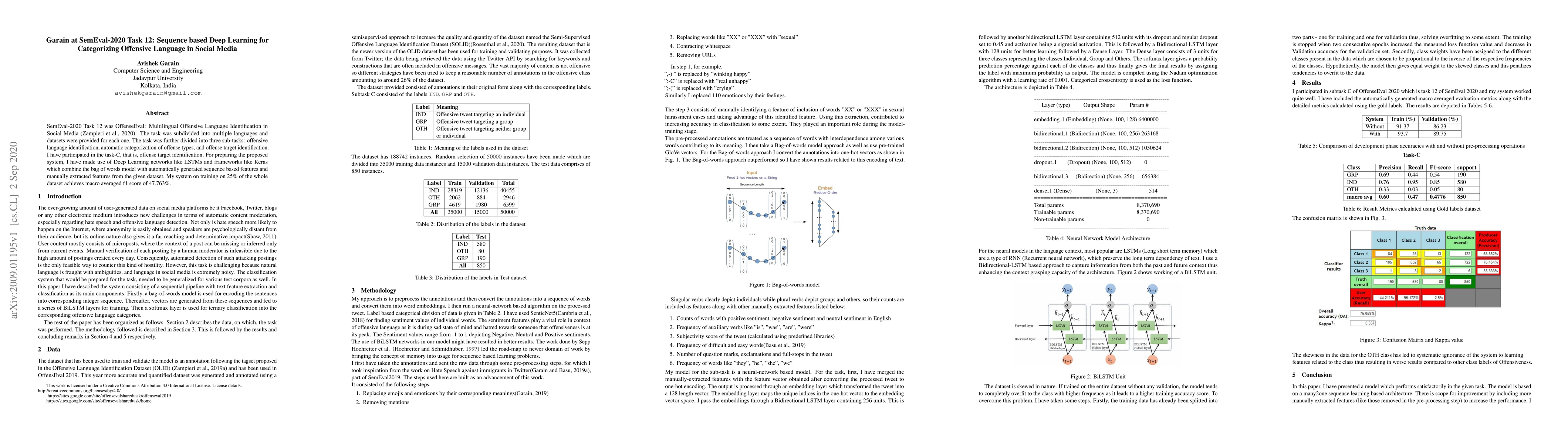 Title: Garain at SemEval-2020 Task 12: Sequence based Deep Learning for Categorizing Offensive Language in Social Media Summary: This paper details a deep learning approach using LSTMs and Keras for identifying offensive language targets in social media, achieving a macro averaged F1 score of 47.763% on a 25% training dataset.
