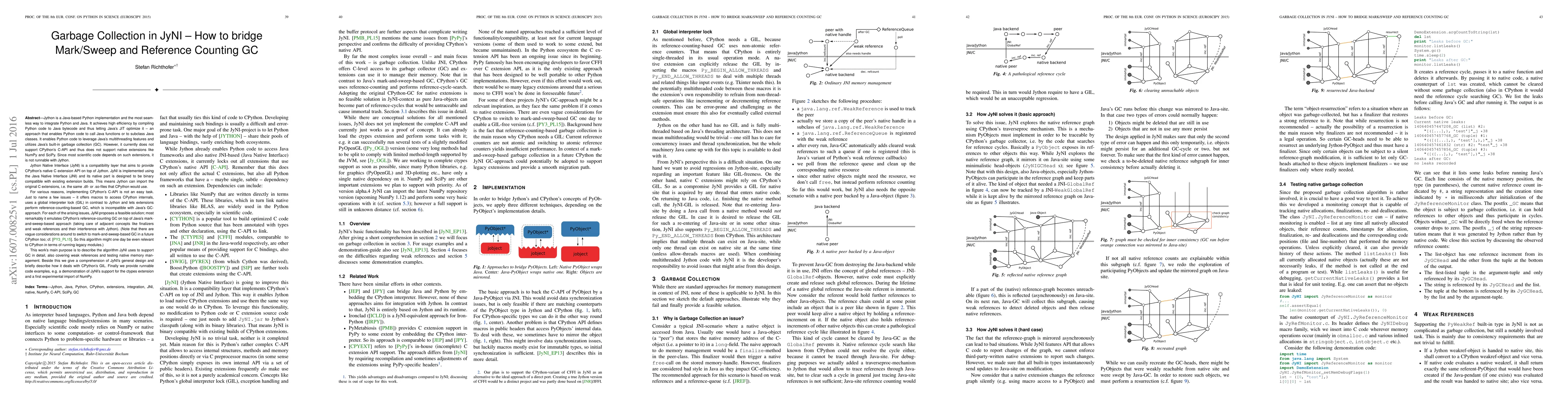 Jython is a Java-based Python implementation and the most seamless way to integrate Python and Java. It achieves high efficiency by compiling Python code to Java bytecode and thus letting Java's JIT optimize it - an approach that enables Python code to call Java functions or to subclass Java classes. It enables Python code to leverage Java's multithreading features and utilizes Java's built-in garbage collection (GC). However, it currently does not support CPython's C-API and thus does not support native extensions like NumPy and SciPy. Since most scientific code depends on such extensions, it is not runnable with Jython. Jython Native Interface (JyNI) is a compatibility layer that aims to provide CPython's native C extension API on top of Jython. JyNI is implemented using the Java Native Interface (JNI) and its native part is designed to be binary compatible with existing extension builds [...].