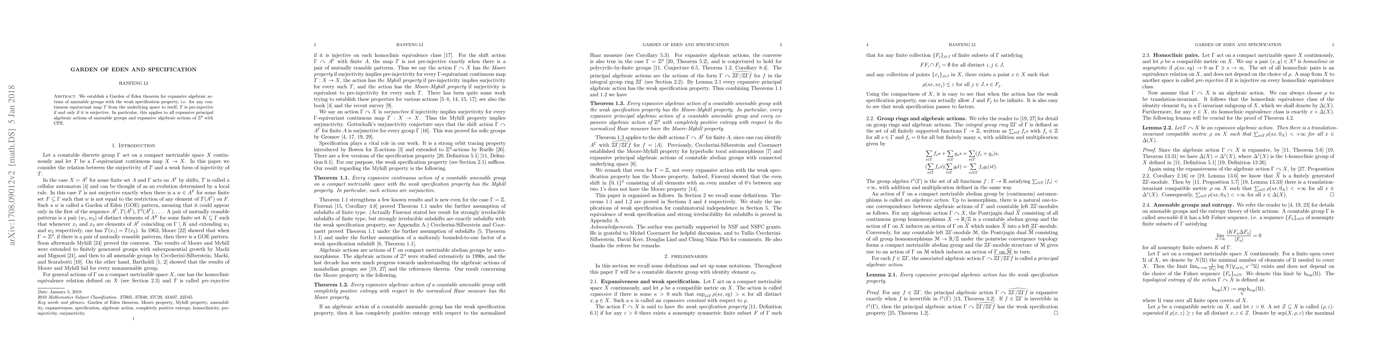 We establish a Garden of Eden theorem for expansive algebraic actions of amenable groups with the weak specification property, i.e. for any continuous equivariant map T from the underlying space to itself, T is pre-injective if and only if it is surjective. In particular, this applies to all expansive principal algebraic actions of amenable groups and expansive algebraic actions of Z^d with CPE.