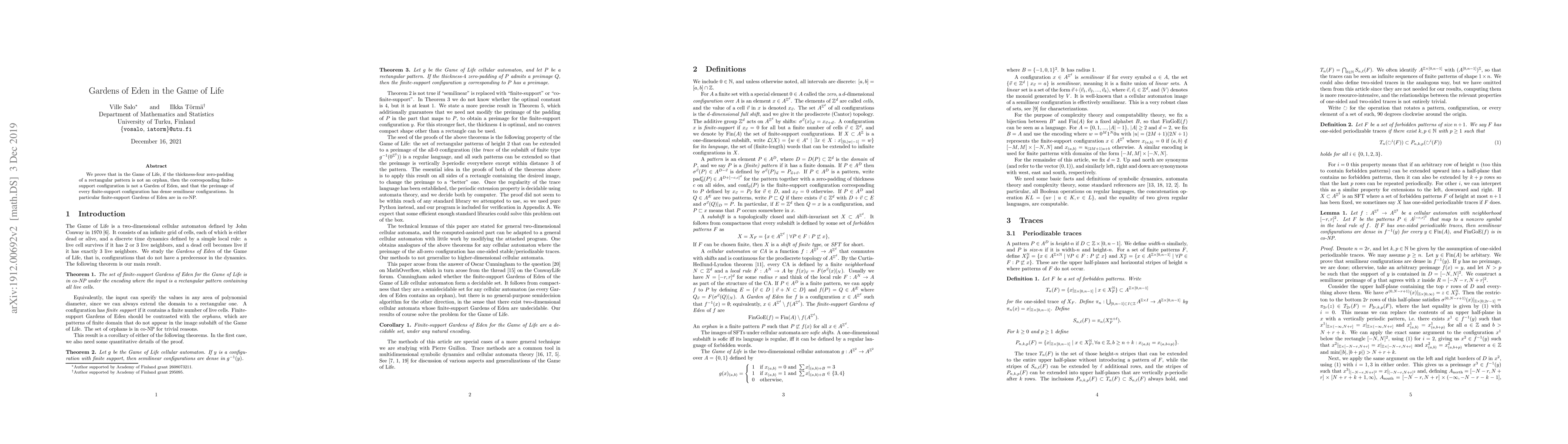 This paper demonstrates that in the Game of Life, a rectangular pattern surrounded by thickness-four zero-padding is not a Garden of Eden if it is not an orphan. It also proves that the preimage of every finite-support configuration includes dense semilinear configurations, placing finite-support Gardens of Eden in the complexity class co-NP.