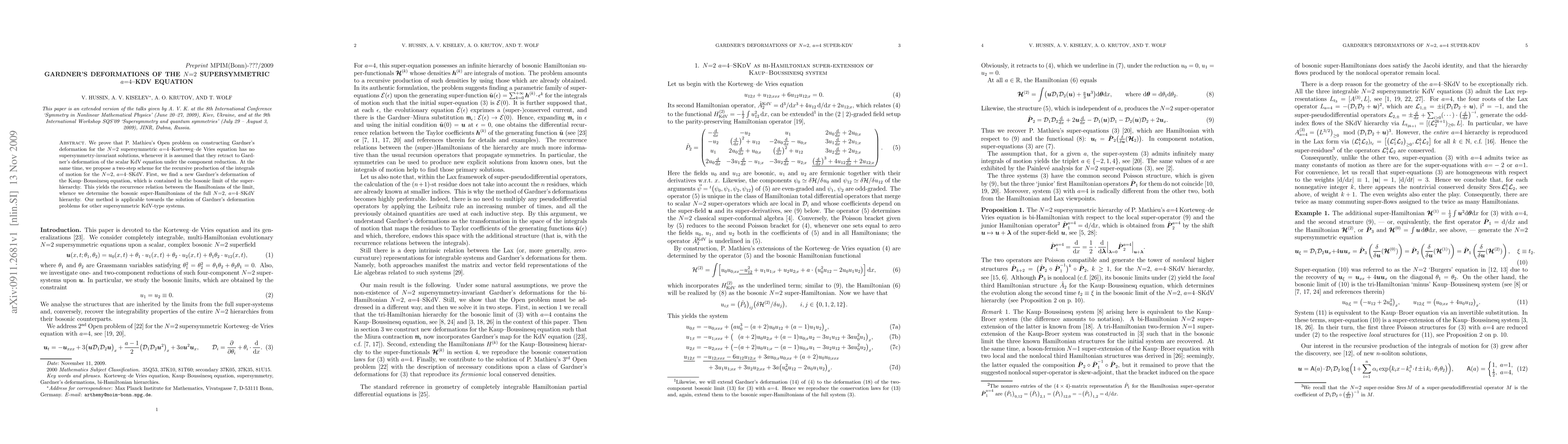 We prove that P.Mathieu's Open problem on constructing Gardner's deformation for the N=2 supersymmetric a=4-Korteweg-de Vries equation has no supersymmetry invariant solutions, whenever it is assumed that they retract to Gardner's deformation of the scalar KdV equation under the component reduction. At the same time, we propose a two-step scheme for the recursive production of the integrals of motion for the N=2, a=4-SKdV. First, we find a new Gardner's deformation of the Kaup-Boussinesq equation, which is contained in the bosonic limit of the super-hierarchy. This yields the recurrence relation between the Hamiltonians of the limit, whence we determine the bosonic super-Hamiltonians of the full N=2, a=4-SKdV hierarchy. Our method is applicable towards the solution of Gardner's deformation problems for other supersymmetric KdV-type systems.
