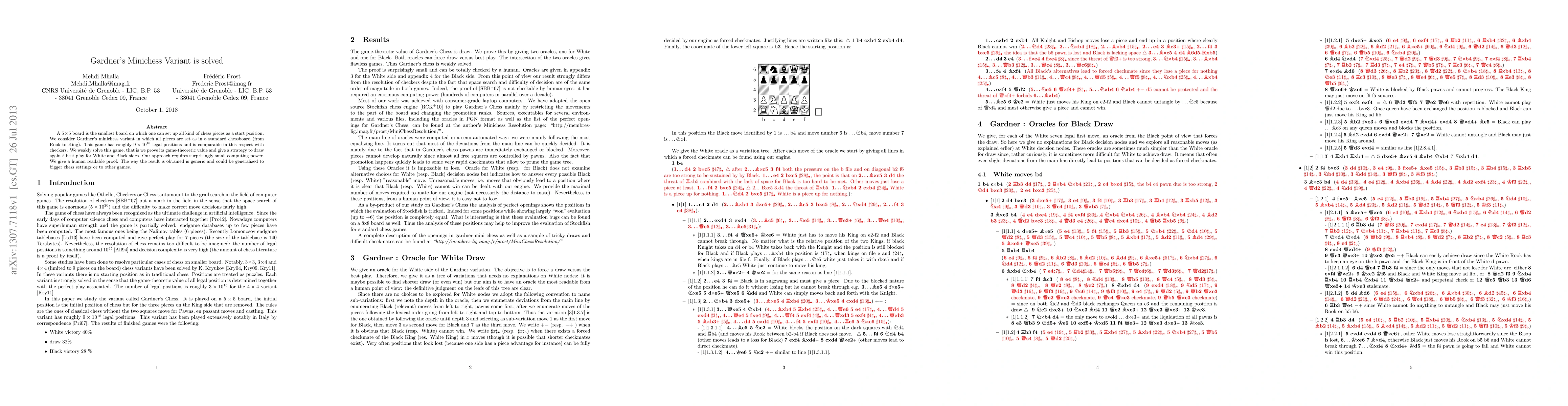 The paper presents a solution to Gardner's minichess variant on a 5x5 board, proving its game-theoretic value and providing strategies for both sides to draw against optimal play. The approach is computationally efficient and offers a human-readable proof, with potential for generalization to larger chess variants or other games.