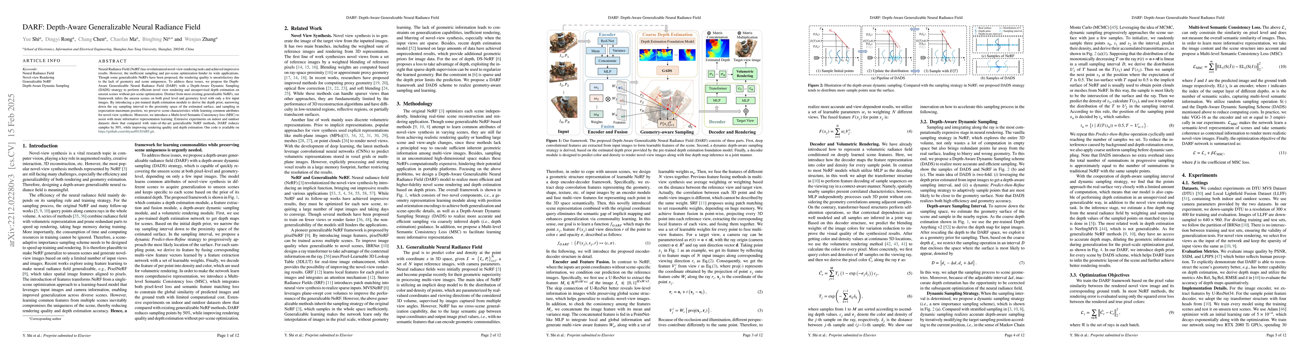 Neural Radiance Field (NeRF) has revolutionized free viewpoint rendering tasks and achieved impressive results. However, the efficiency and accuracy problems hinder its wide applications. To address these issues, we propose Geometry-Aware Generalized Neural Radiance Field (GARF) with a geometry-aware dynamic sampling (GADS) strategy to perform real-time novel view rendering and unsupervised depth estimation on unseen scenes without per-scene optimization. Distinct from most existing generalized NeRFs, our framework infers the unseen scenes on both pixel-scale and geometry-scale with only a few input images. More specifically, our method learns common attributes of novel-view synthesis by an encoder-decoder structure and a point-level learnable multi-view feature fusion module which helps avoid occlusion. To preserve scene characteristics in the generalized model, we introduce an unsupervised depth estimation module to derive the coarse geometry, narrow down the ray sampling interval to proximity space of the estimated surface and sample in expectation maximum position, constituting Geometry-Aware Dynamic Sampling strategy (GADS). Moreover, we introduce a Multi-level Semantic Consistency loss (MSC) to assist more informative representation learning. Extensive experiments on indoor and outdoor datasets show that comparing with state-of-the-art generalized NeRF methods, GARF reduces samples by more than 25\%, while improving rendering quality and 3D geometry estimation.