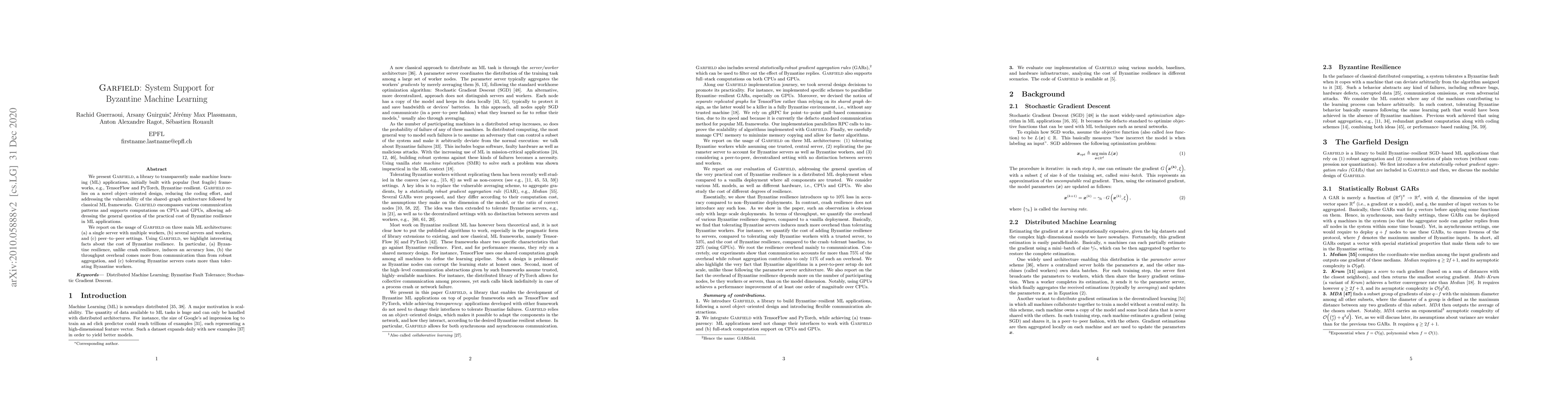 Garfield is a library that makes machine learning applications resilient to Byzantine failures, reducing accuracy loss and computational overhead. Its study highlights the costs of Byzantine resilience in SGD-based ML applications.
