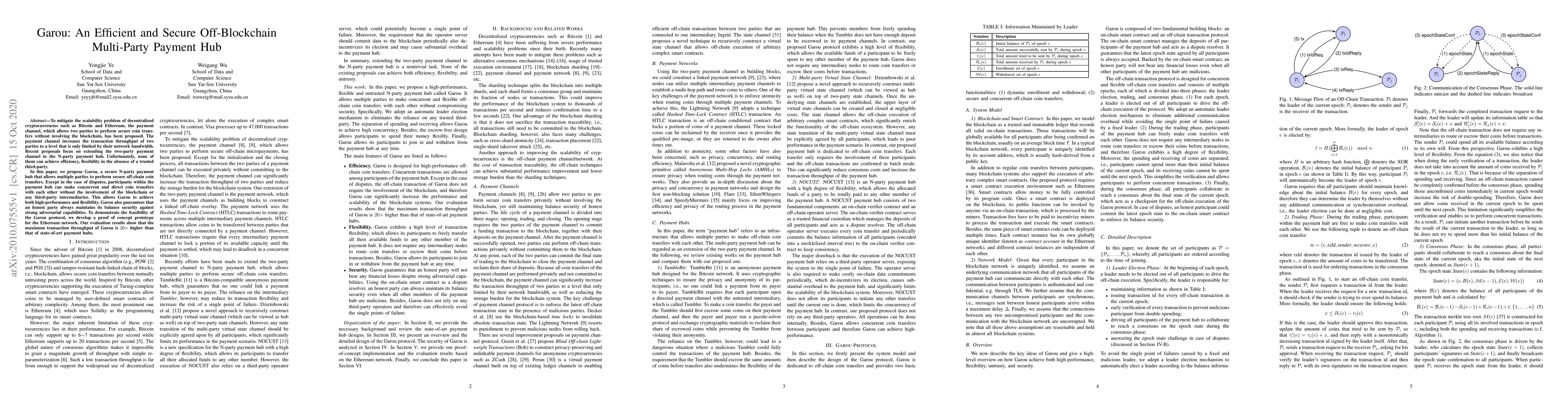 Garou proposes an efficient and secure N-party payment hub for off-blockchain coin transfers, achieving high transaction throughput without the need for a trusted third-party. The prototype demonstrates a 20-fold increase in transaction speed compared to existing solutions.