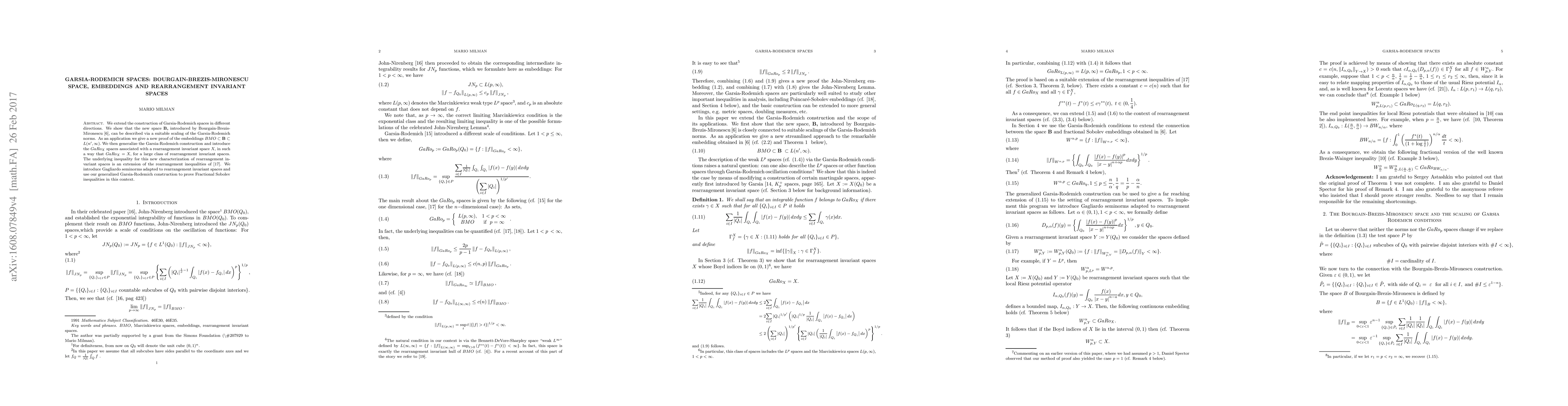 We extend the construction of Garsia-Rodemich spaces in different directions. We show that the new space \textbf{B,} introduced by Bourgain-Brezis-Mironescu \cite{bbm}, can be described via a suitable scaling of the Garsia-Rodemich norms. As an application we give a new proof of the embeddings $BMO\subset$ \textbf{B }$\subset$ $L(n^{\prime},\infty).$ We then generalize the Garsia-Rodemich construction and introduce the $GaRo_{X}$ spaces associated with a rearrangement invariant space $X,$ in such a way that $GaRo_{X}=X,$ for a large class of rearrangement invariant spaces. The underlying inequality for this new characterization of rearrangement invariant spaces is an extension of the rearrangement inequalities of \cite{milbmo}. We introduce Gagliardo seminorms adapted to rearrangement invariant spaces and use our generalized Garsia-Rodemich construction to prove Fractional Sobolev inequalities in this context.