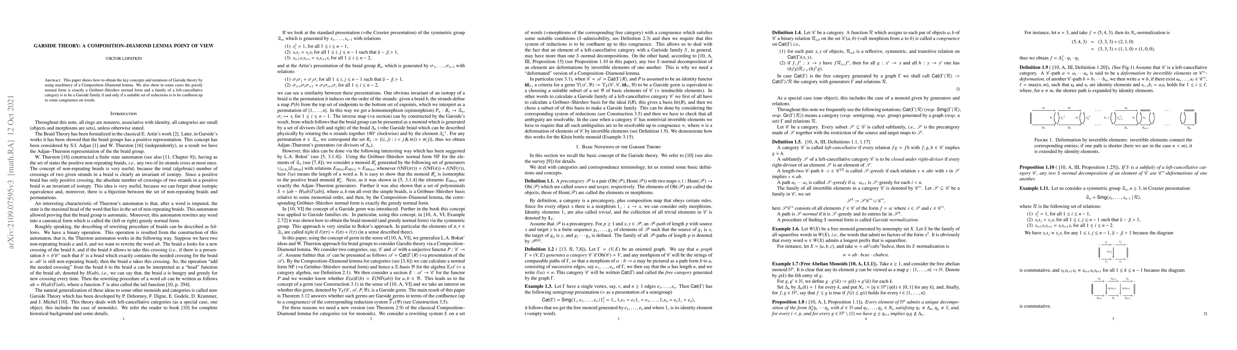 This paper shows how to obtain the key concepts and notations of Garside theory by using the Composition--Diamond lemma. We also show in some cases the greedy normal form is exactly a Gr\"obner--Shirshov normal form and a family of a left-cancellative category is a Garside family, if and only if a suitable set of reductions is confluent up to some congruence on words.