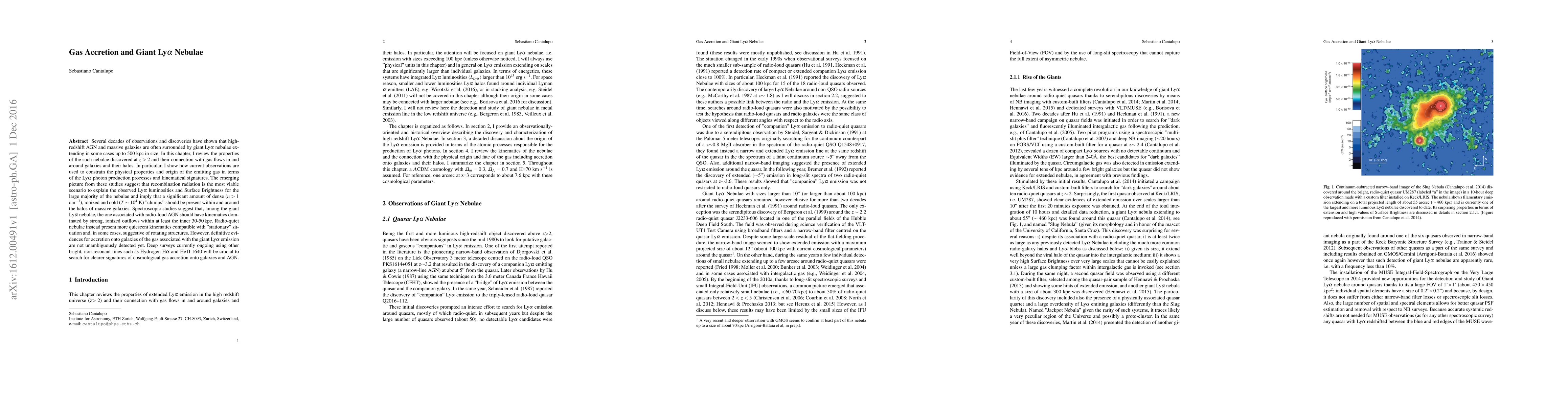 This review explores giant Lyman-alpha nebulae surrounding high-redshift AGN and massive galaxies, suggesting recombination radiation explains their luminosity. It highlights the presence of dense, ionized gas in galaxy halos, with radio-loud AGN showing strong outflows, while radio-quiet AGN exhibit more quiescent kinematics.