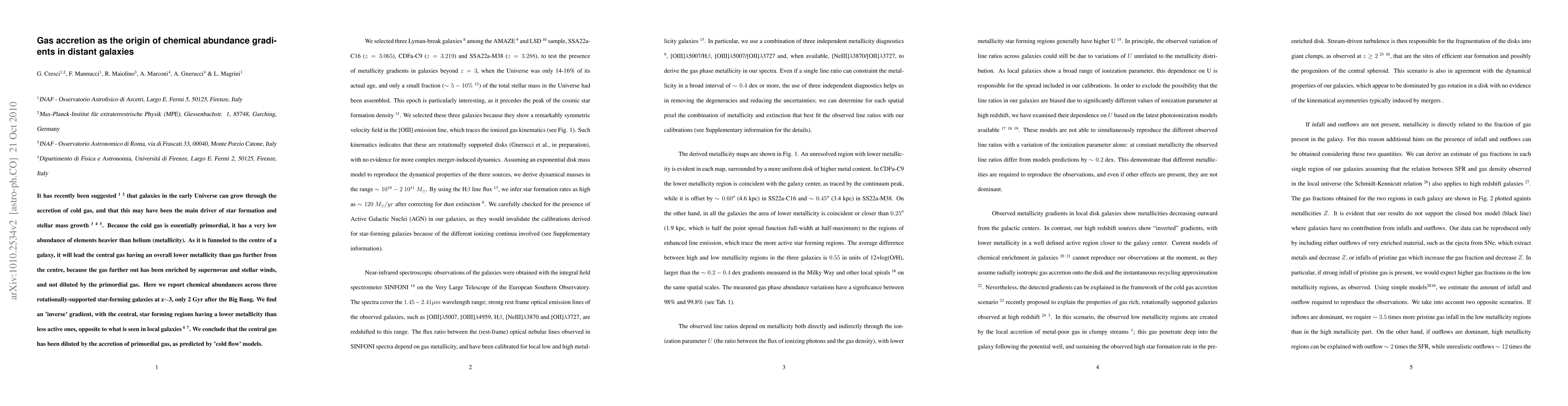 This paper investigates the chemical abundance gradients in distant galaxies at z~3, finding an inverse gradient where central regions have lower metallicity due to the accretion of primordial gas, supporting cold flow models. This contrasts with local galaxies, indicating a unique growth mechanism in the early Universe.