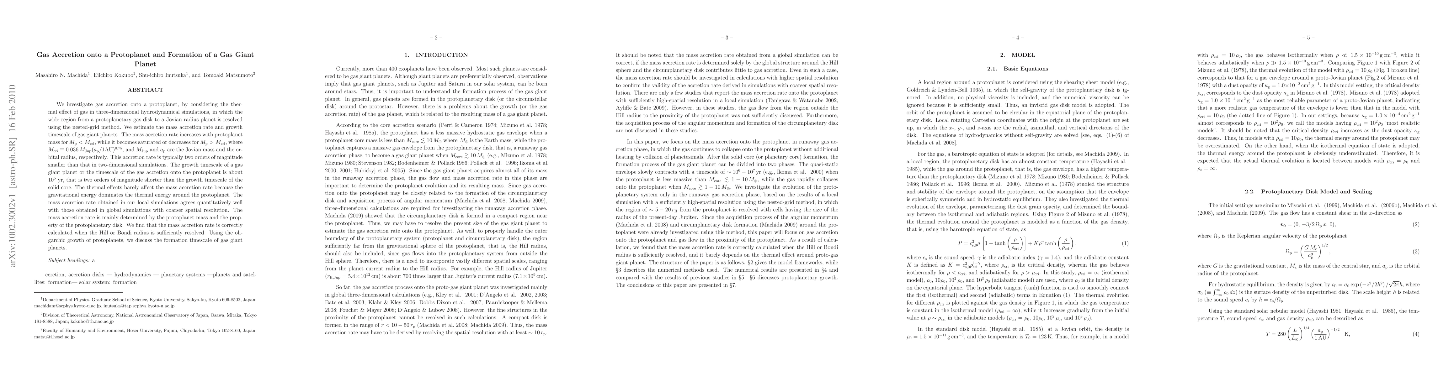 This paper investigates gas accretion onto a protoplanet through 3D hydrodynamical simulations, finding that the mass accretion rate increases with protoplanet mass until a critical mass (M_cri) is reached, after which it saturates or decreases. The growth timescale for gas giant planets is about 10^5 years, significantly shorter than that of their solid cores.