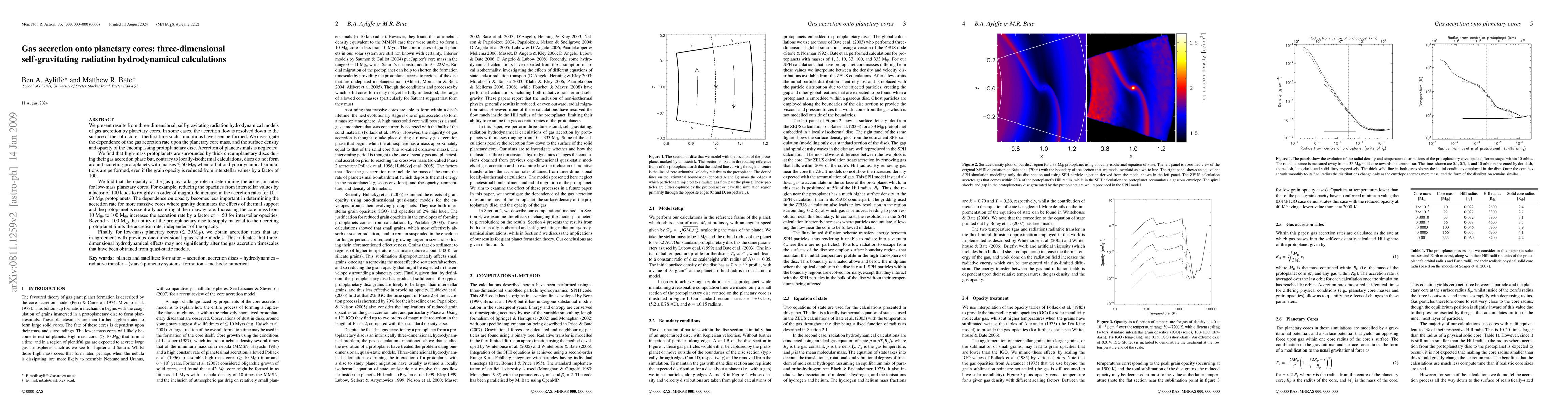 This paper presents three-dimensional self-gravitating radiation hydrodynamical simulations of gas accretion onto planetary cores, finding that high-mass protoplanets form thick circumplanetary discs, while low-mass cores (<50M_Earth) do not, contrary to isothermal models. The study highlights the significant role of gas opacity in accretion rates, especially for low-mass cores.