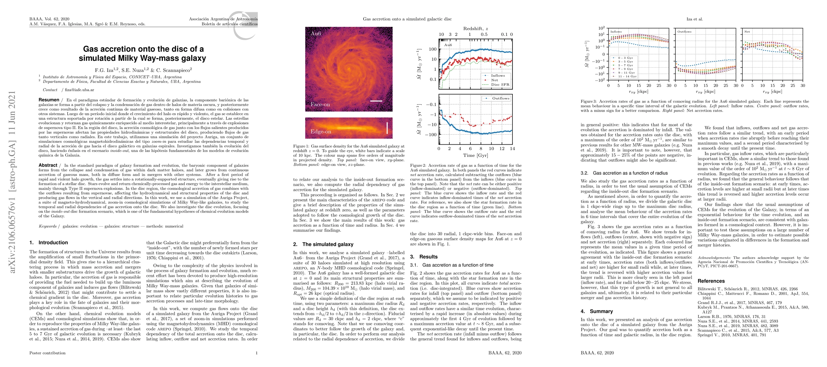 In the standard paradigm of galaxy formation and evolution, the baryonic component of galaxies forms from the collapse and condensation of gas within dark matter haloes, and later grows from continuous accretion of gaseous mass, both in diffuse form and in mergers with other systems. After a first period of rapid and violent halo growth, the gas settles into a rotationally-supported structure, eventually giving rise to the formation of a stellar disc. Stars evolve and return chemically-processed gas and energy to the interstellar medium, mainly through Type II supernova explosions. In the disc region, the cosmological accretion of gas combines with the outflows resulting from supernovae, affecting the hydrodynamical and structural properties of the disc and producing gas flows in the vertical and radial directions. In this work, we use a simulation of the Auriga Project, a suite of magneto-hydrodynamical, zoom-in cosmological simulations of Milky Way-like galaxies, to study the temporal and radial dependencies of gas accretion onto the disc. We also investigate the disc evolution, focusing on the inside-out disc formation scenario, which is one of the fundamental hypotheses of chemical evolution models of the Galaxy.