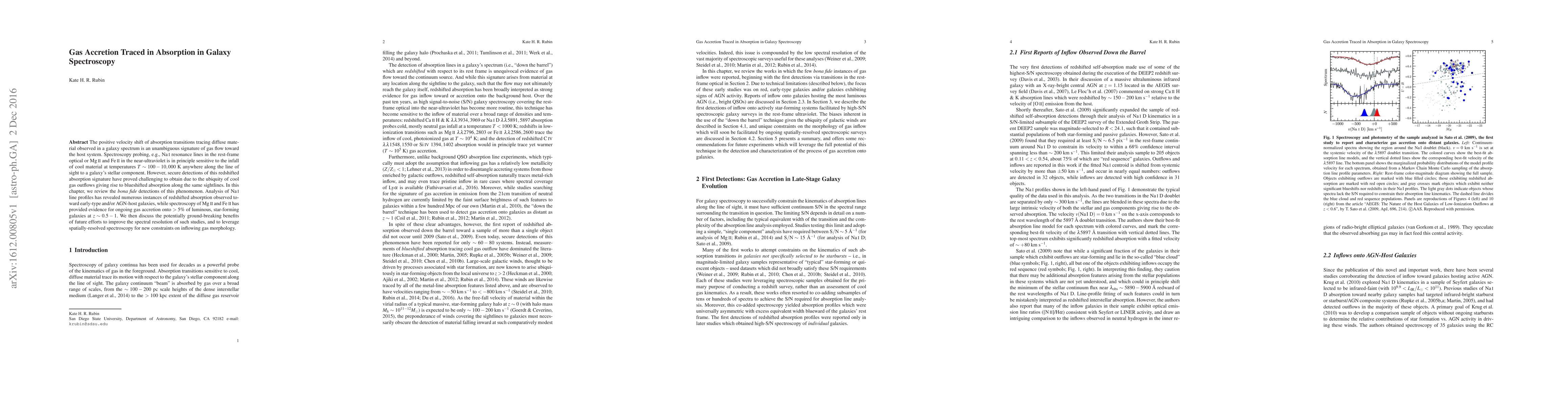 The positive velocity shift of absorption transitions tracing diffuse material observed in a galaxy spectrum is an unambiguous signature of gas flow toward the host system. Spectroscopy probing, e.g., NaI D resonance lines in the rest-frame optical or MgII and FeII in the near-ultraviolet is in principle sensitive to the infall of cool material at temperatures ~ 100-10,000 K anywhere along the line of sight to a galaxy's stellar component. However, secure detections of this redshifted absorption signature have proved challenging to obtain due to the ubiquity of cool gas outflows giving rise to blueshifted absorption along the same sightlines. In this chapter, we review the bona fide detections of this phenomenon. Analysis of NaI D line profiles has revealed numerous instances of redshifted absorption observed toward early-type and/or AGN-host galaxies, while spectroscopy of MgII and FeII has provided evidence for ongoing gas accretion onto >5% of luminous, star-forming galaxies at z ~ 0.5-1. We then discuss the potentially ground-breaking benefits of future efforts to improve the spectral resolution of such studies, and to leverage spatially-resolved spectroscopy for new constraints on inflowing gas morphology.