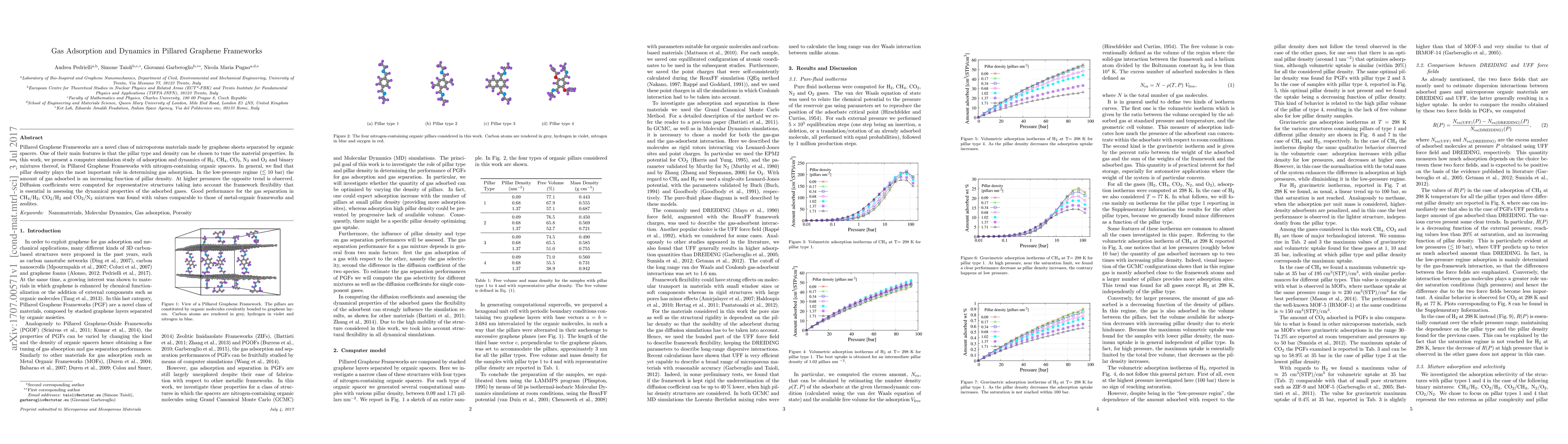 This paper presents a computer simulation study on gas adsorption and dynamics in Pillared Graphene Frameworks, finding that pillar density significantly influences gas adsorption, with higher densities enhancing low-pressure adsorption but reducing it at higher pressures. The study also reports effective gas separation performance for mixtures comparable to metal-organic frameworks and zeolites.