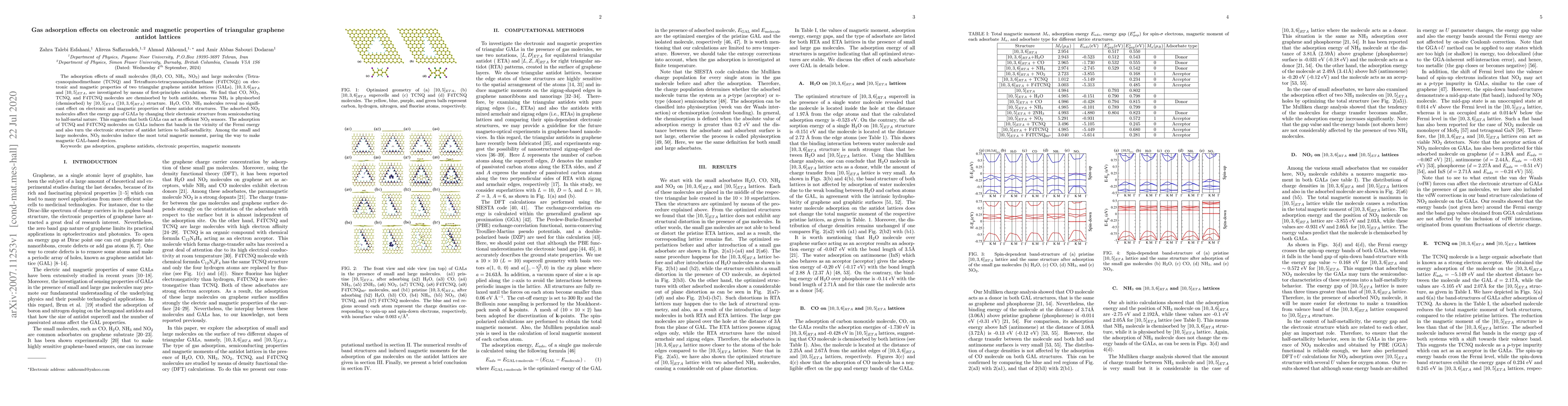 The paper investigates how small and large molecules adsorb onto triangular graphene antidot lattices, affecting their electronic and magnetic properties. Adsorbed NO₂ and TCNQ/F4TCNQ molecules notably transform the lattices' electronic structure to half-metallicity, indicating potential for NO₂ sensing and magnetic device applications.