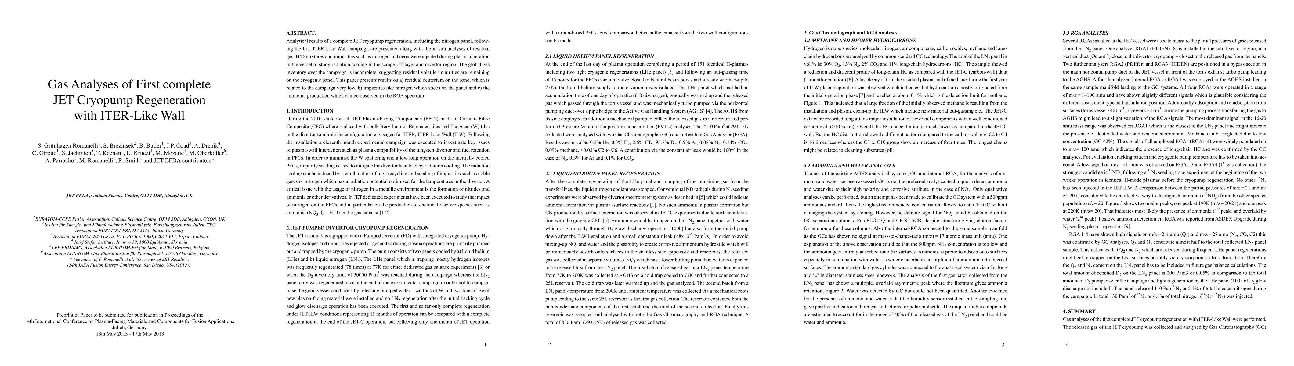 This paper reports on the first complete JET cryopump regeneration after an ITER-Like Wall campaign, detailing residual gas analyses. It finds low residual deuterium, persistent nitrogen impurities, and detectable ammonia production, indicating incomplete global gas inventory and residual volatile impurities on the cryogenic panel.