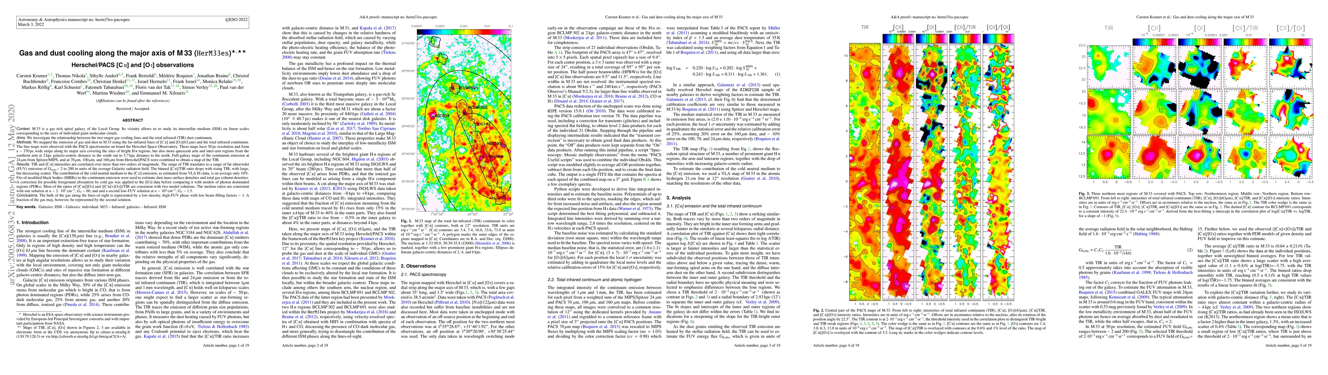 M33 is a gas rich spiral galaxy of the Local Group. We investigate the relationship between the two major gas cooling lines and the total infrared (TIR) dust continuum. We mapped the emission of gas and dust in M33 using the far-infrared lines of [CII] and [OI](63um) and the TIR. The line maps were observed with Herschel/PACS. These maps have 50pc resolution and form a ~370pc wide stripe along its major axis covering the sites of bright HII regions, but also more quiescent arm and inter-arm regions from the southern arm at 2kpc galacto-centric distance to the south out to 5.7kpc distance to the north. Full-galaxy maps of the continuum emission at 24um from Spitzer/MIPS, and at 70um, 100um, and 160um from PACS were combined to obtain a map of the TIR. TIR and [CII] intensities are correlated over more than two orders of magnitude. The range of TIR translates to a range of far ultraviolet (FUV) emission of G0,obs~2 to 200 in units of the average Galactic radiation field. The binned [CII]/TIR ratio drops with rising TIR, with large, but decreasing scatter. Fits of modified black bodies (MBBs) to the continuum emission were used to estimate dust mass surface densities and total gas column densities. A correction for possible foreground absorption by cold gas was applied to the [OI] data before comparing it with models of photon dominated regions (PDRs). Most of the ratios of [CII]/[OI] and ([CII]+[OI])/TIR are consistent with two model solutions. The median ratios are consistent with one solution at n~2x10^2 cm-3, G0~60, and and a second low-FUV solution at n~10^4 cm-3, G0~1.5. The bulk of the gas along the lines-of-sight is represented by a low-density, high-FUV phase with low beam filling factors ~1. A fraction of the gas may, however, be represented by the second solution.