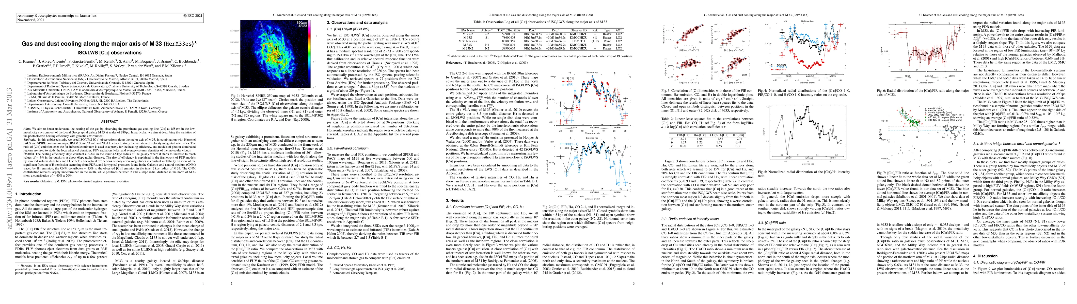 We aim to better understand the heating of the gas by observing the prominent gas cooling line [CII] at 158um in the low-metallicity environment of the Local Group spiral galaxy M33 at scales of 280pc. In particular, we aim at describing the variation of the photoelectric heating efficiency with galactic environment. In this unbiased study, we used ISO/LWS [CII] observations along the major axis of M33, in combination with Herschel PACS and SPIRE continuum maps, IRAM 30m CO 2-1 and VLA HI data to study the variation of velocity integrated intensities. The ratio of [CII] emission over the far-infrared continuum is used as a proxy for the heating efficiency, and models of photon-dominated regions are used to study the local physical densities, FUV radiation fields, and average column densities of the molecular clouds. The heating efficiency stays constant at 0.8% in the inner 4.5kpc radius of the galaxy where it starts to increase to reach values of ~3% in the outskirts at about 6kpc radial distance. The rise of efficiency is explained in the framework of PDR models by lowered volume densities and FUV fields, for optical extinctions of only a few magnitudes at constant metallicity. In view of the significant fraction of HI emission stemming from PDRs, and for typical pressures found in the Galactic cold neutral medium (CNM) traced by HI emission, the CNM contributes ~15% to the observed [CII] emission in the inner 2kpc radius of M33. The CNM contribution remains largely undetermined in the south, while positions between 2 and 7.3kpc radial distance in the north of M33 show a contribution of ~40%+-20%.