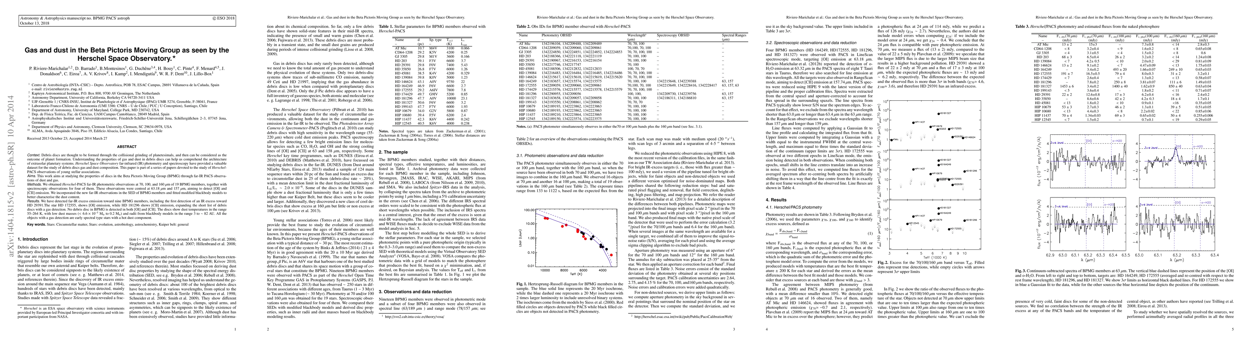 This paper investigates the gas and dust properties in the Beta Pictoris Moving Group using Herschel Space Observatory's far-infrared observations, revealing far-IR excess emission in nine members and detecting [OI] and [CII] emissions in two, indicating the presence of gas in debris discs. The study finds low dust masses and temperatures ranging from 55 to 264 K.