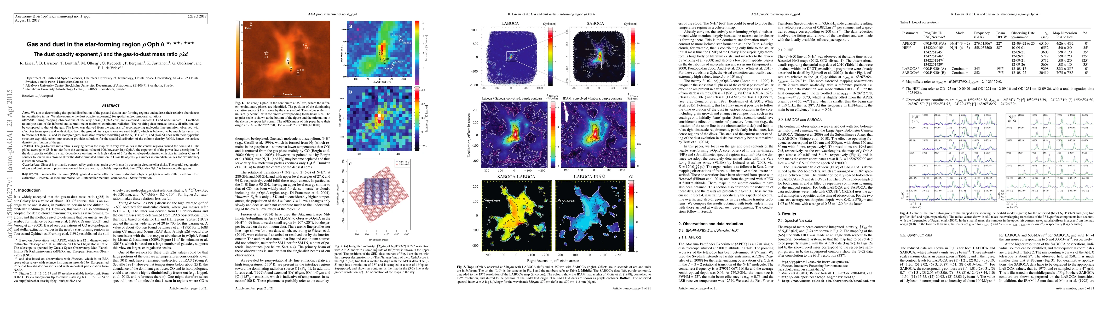 We aim at determining the spatial distribution of the gas and dust in star-forming regions and address their relative abundances in quantitative terms. We also examine the dust opacity exponent beta for spatial and/or temporal variations. Using mapping observations of the very dense rho Oph A core, we examined standard 1D and non-standard 3D methods to analyse data of far-infrared and submillimeter (submm) continuum radiation. The resulting dust surface density distribution can be compared to that of the gas. The latter was derived from the analysis of accompanying molecular line emission, observed with Herschel from space and with APEX from the ground. As a gas tracer we used N2H+, which is believed to be much less sensitive to freeze-out than CO and its isotopologues. Radiative transfer modelling of the N2H+(J=3-2) and (J=6-5) lines with their hyperfine structure explicitly taken into account provides solutions for the spatial distribution of the column density N(H2), hence the surface density distribution of the gas. The gas-to-dust mass ratio is varying across the map, with very low values in the central regions around the core SM 1. The global average, =88, is not far from the canonical value of 100, however. In rho Oph A, the exponent beta of the power-law description for the dust opacity exhibits a clear dependence on time, with high values of 2 for the envelope-dominated emission in starless Class -1 sources to low values close to 0 for the disk-dominated emission in Class III objects. beta assumes intermediate values for evolutionary classes in between. Since beta is primarily controlled by grain size, grain growth mostly occurs in circumstellar disks. The spatial segregation of gas and dust, seen in projection toward the core centre, probably implies that, like C18O, also N2H+ is frozen onto the grains.