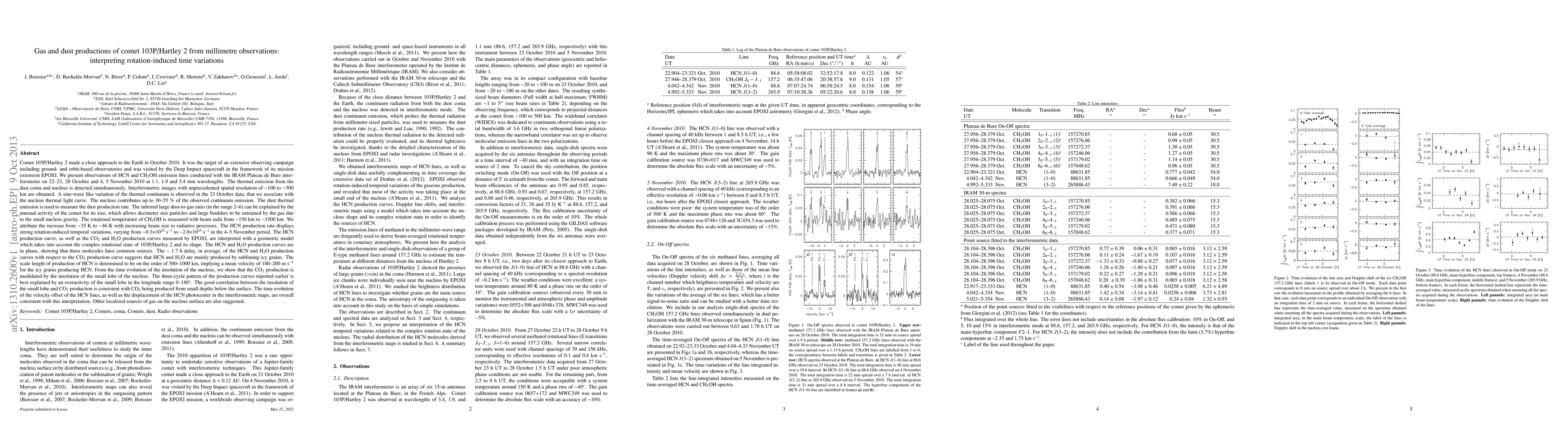 Comet 103P/Hartley 2 made a close approach to the Earth in October 2010. It was the target of an extensive observing campaign and was visited by the Deep Impact spacecraft (mission EPOXI). We present observations of HCN and CH3OH emission lines conducted with the IRAM Plateau de Bure interferometer on 22-23, 28 October and 4, 5 November 2010 at 1.1, 1.9 and 3.4 mm wavelengths. The thermal emission from the dust coma and nucleus is detected simultaneously. Interferometric images with unprecedented spatial resolution are obtained. A sine-wave variation of the thermal continuum is observed in the 23 October data, that we associate with the nucleus thermal light curve. The nucleus contributes up to 30-55 % of the observed continuum. The large dust-to-gas ratio (in the range 2-6) can be explained by the unusual activity of the comet for its size, which allows decimeter size particles and large boulders to be entrained by the gas. The rotational temperature of CH3OH is measured. We attribute the increase from 35 to 46 K with increasing beam size (from 150 to 1500 km) to radiative processes. The HCN production rate displays strong rotation-induced variations. The HCN production curve, as well as those of CO2 and H2O measured by EPOXI, are interpreted with a geometric model which takes into account the rotation and the shape of the comet. The HCN and H2O production curves are in phase, showing common sources. The 1.7h delay, in average, of HCN and H2O with respect to the CO2 production curve suggests that HCN and H2O are mainly produced by subliming icy grains. The scale length of production of HCN is determined to be on the order of 500-1000 km, implying a mean velocity of 100-200 m/s for the icy grains producing HCN. The modulation of the CO2 prouction and of the velocity offset of the HCN lines are interpreted in terms of localized sources of gas on the nucleus surface.