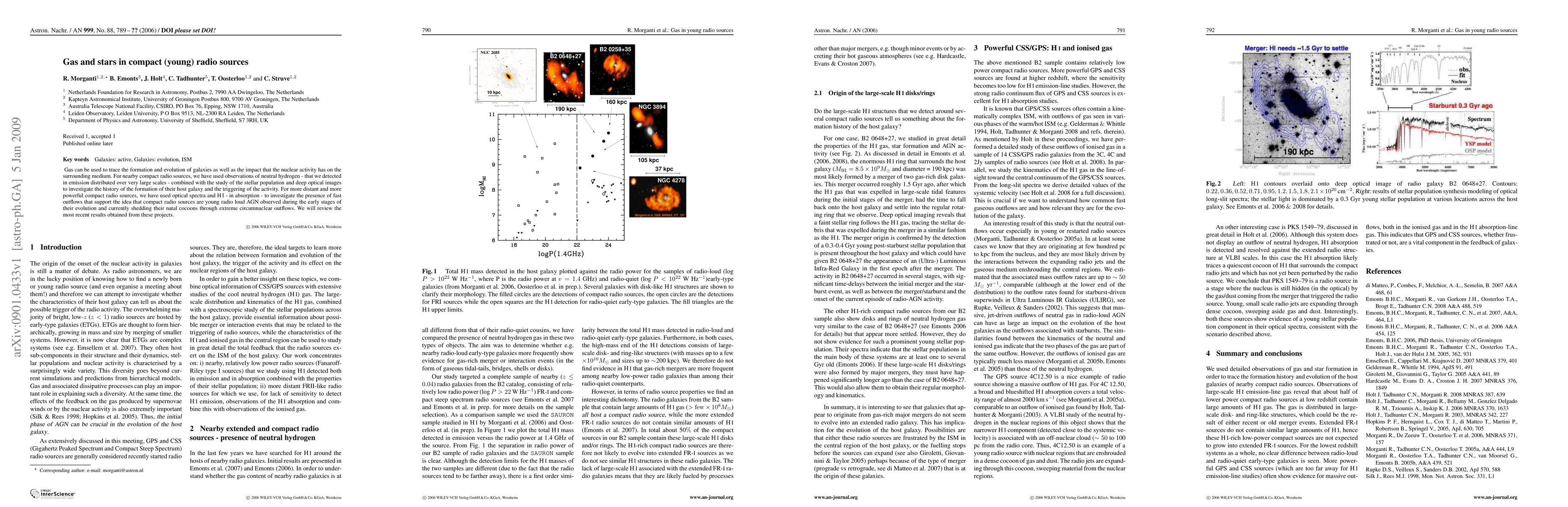 Gas can be used to trace the formation and evolution of galaxies as well as the impact that the nuclear activity has on the surrounding medium. For nearby compact radio sources, we have used observations of neutral hydrogen - that we detected in emission distributed over very large scales - combined with the study of the stellar population and deep optical images to investigate the history of the formation of their host galaxy and the triggering of the activity. For more distant and more powerful compact radio sources, we have used optical spectra and HI - in absorption - to investigate the presence of fast outflows that support the idea that compact radio sources are young radio loud AGN observed during the early stages of their evolution and currently shredding their natal cocoons through extreme circumnuclear outflows. We will review the most recent results obtained from these projects.