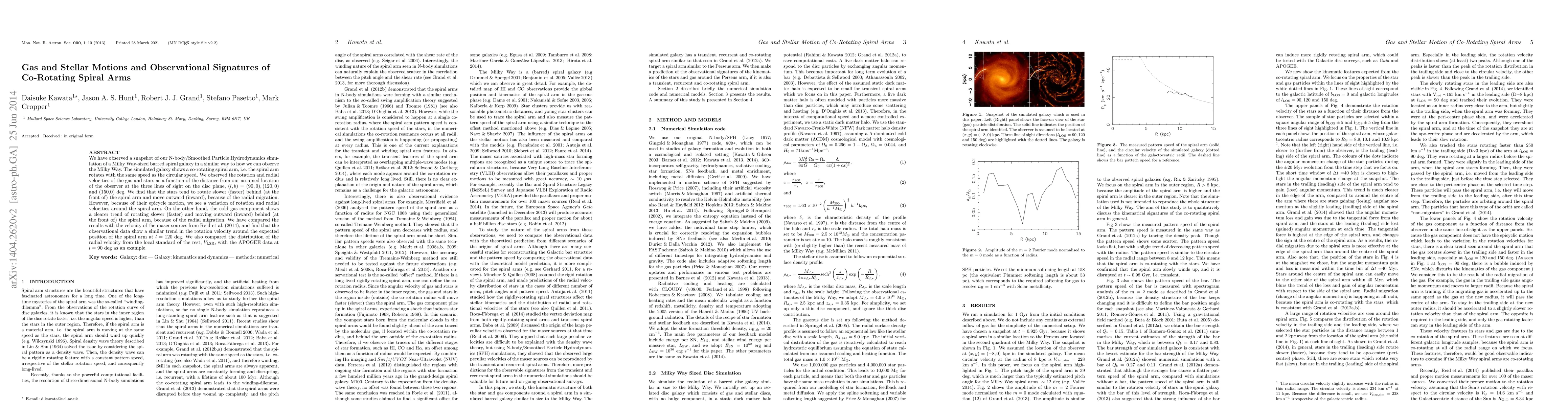 This study simulates a Milky Way-sized barred spiral galaxy, observing gas and stellar motions. It finds stars rotate slower behind spiral arms, moving outward due to migration, while cold gas shows clearer outward motion at slower speeds behind arms. The findings align with observational data from Reid et al. (2014) and APOGEE data at l = 90 deg.