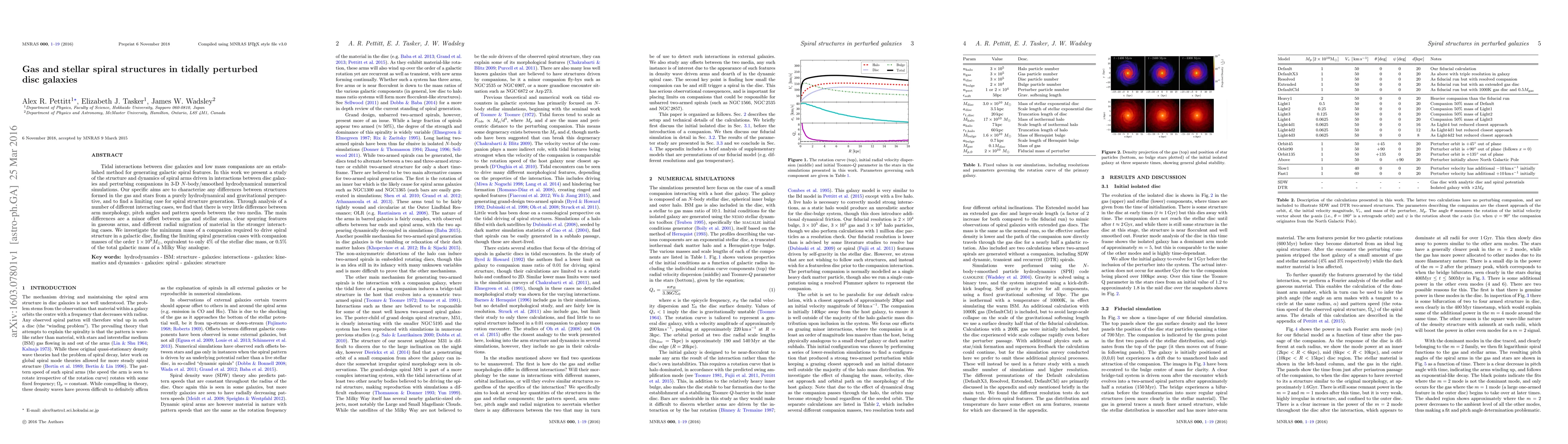 This paper investigates the formation of gas and stellar spiral structures in tidally perturbed disc galaxies using 3-D N-body/hydrodynamical simulations. It finds minimal differences in arm morphology between gas and stars, with minor offsets and spurring features in gaseous arms, and identifies a companion mass of $1\times10^9M_\odot$ as the minimum to generate spiral structures.