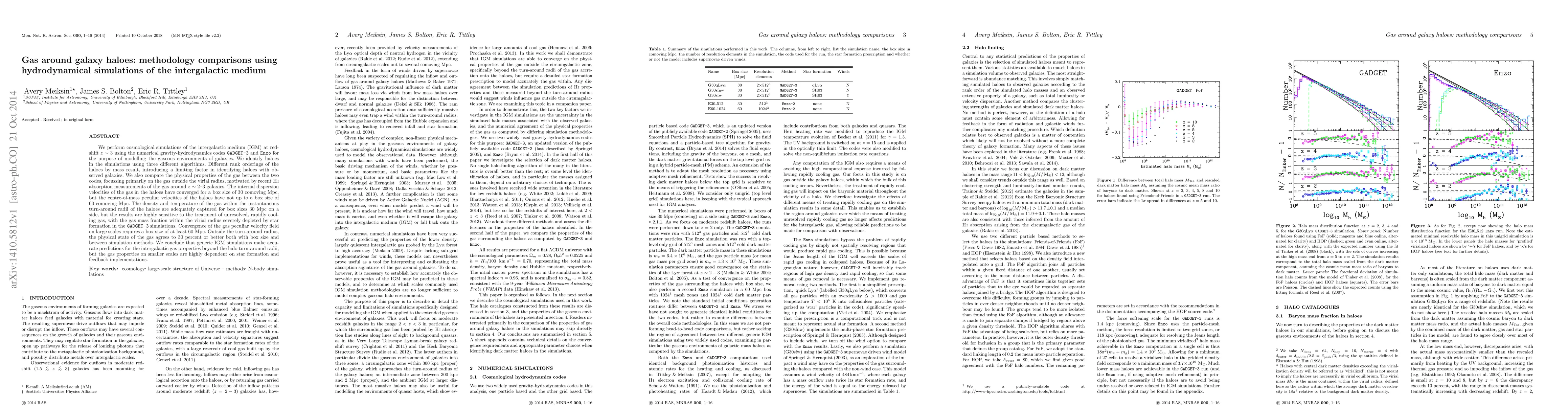 We perform cosmological simulations of the intergalactic medium (IGM) at redshift z ~ 3 using the numerical gravity-hydrodynamics codes GADGET-3 and Enzo for the purpose of modelling the gaseous environments of galaxies. We identify haloes in the simulations using three different algorithms. Different rank orderings of the haloes by mass result, introducing a limiting factor in identifying haloes with observed galaxies. We also compare the physical properties of the gas between the two codes, focussing primarily on the gas outside the virial radius, motivated by recent HI absorption measurements of the gas around z ~ 2 - 3 galaxies. The internal dispersion velocities of the gas in the haloes have converged for a box size of 30 comoving Mpc, but the centre-of-mass peculiar velocities of the haloes have not up to a box size of 60 comoving Mpc. The density and temperature of the gas within the instantaneous turn-around radii of the haloes are adequately captured for box sizes 30 Mpc on a side, but the results are highly sensitive to the treatment of unresolved, rapidly cooling gas, with the gas mass fraction within the virial radius severely depleted by star formation in the GADGET-3 simulations. Convergence of the gas peculiar velocity field on large scales requires a box size of at least 60 Mpc. Outside the turn-around radius, the physical state of the gas agrees to 30 percent or better both with box size and between simulation methods. We conclude that generic IGM simulations make accurate predictions for the intergalactic gas properties beyond the halo turn-around radii, but the gas properties on smaller scales are highly dependent on star formation and feedback implementations.