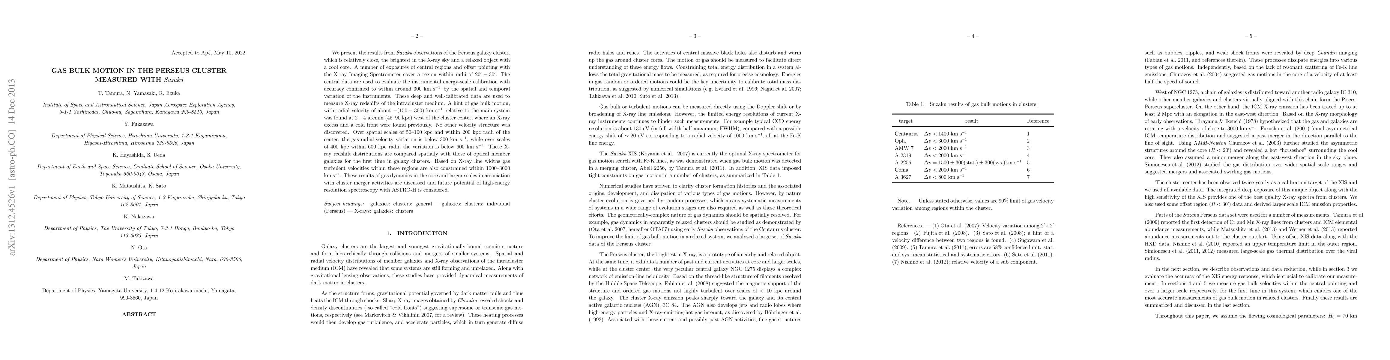 Researchers used Suzaku observations to measure gas bulk motion in the Perseus galaxy cluster, finding a hint of radial velocity of 150-300 km/s at 2-4 arcmin west of the center, and constrained turbulent velocities within 1000-3000 km/s.