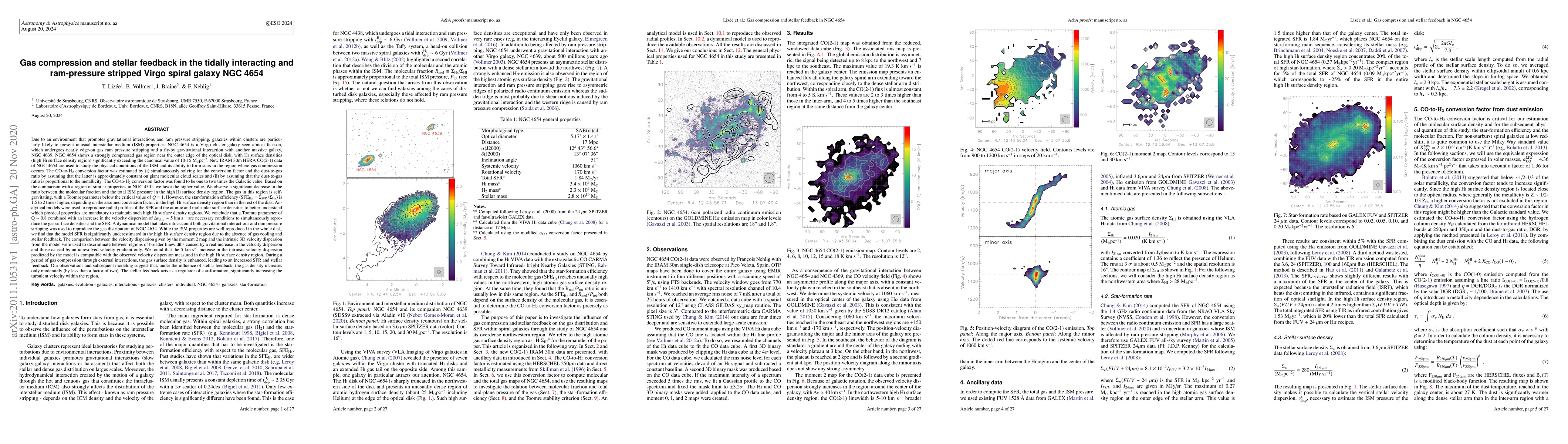 NGC 4654 is a Virgo galaxy seen almost face-on, which undergoes nearly edge-on gas ram pressure stripping and a fly-by gravitational interaction with another massive galaxy, NGC 4639. NGC 4654 shows a strongly compressed gas region near the outer edge of the optical disk, with HI surface densities (HSDR), exceeding the canonical value of 10-15 Msun/pc2. New IRAM 30m HERA CO(2-1) data of NGC 4654 are used to study the physical conditions of the ISM. The CO-to-H$_2$ conversion factor was estimated and found to be one to two times the Galactic value with significant decrease in the ratio between the molecular fraction and the total ISM pressure in the HSDR, self-gravitating gas, a Toomre parameter below $Q=1$ and star-formation efficiency 1.5-2 times higher. Analytical models were used to reproduce radial profiles of the SFR and the atomic and molecular surface densities. A Toomre parameter of $\rm Q \sim 0.8$ combined with an increase in the velocity dispersion of 5 km/s are necessary conditions to simultaneously reproduce the gas surface densities and the SFR. A dynamical model was used to reproduce the gas distribution of NGC 4654. The comparison between the velocity dispersion given by the moment 2 map and the intrinsic 3D velocity dispersion from the model were used to discriminate between regions of broader linewidths caused by a real increase in the velocity dispersion and those caused by an unresolved velocity gradient only. We found that the 5 km/s increase in the intrinsic velocity dispersion is compatible with observations. During a period of gas compression through external interactions, the gas surface density is enhanced, leading to an increased SFR and stellar feedback. Under the influence of stellar feedback, the gas density increases only moderately. The stellar feedback acts as a regulator of star-formation, increasing the turbulent velocity within the region.