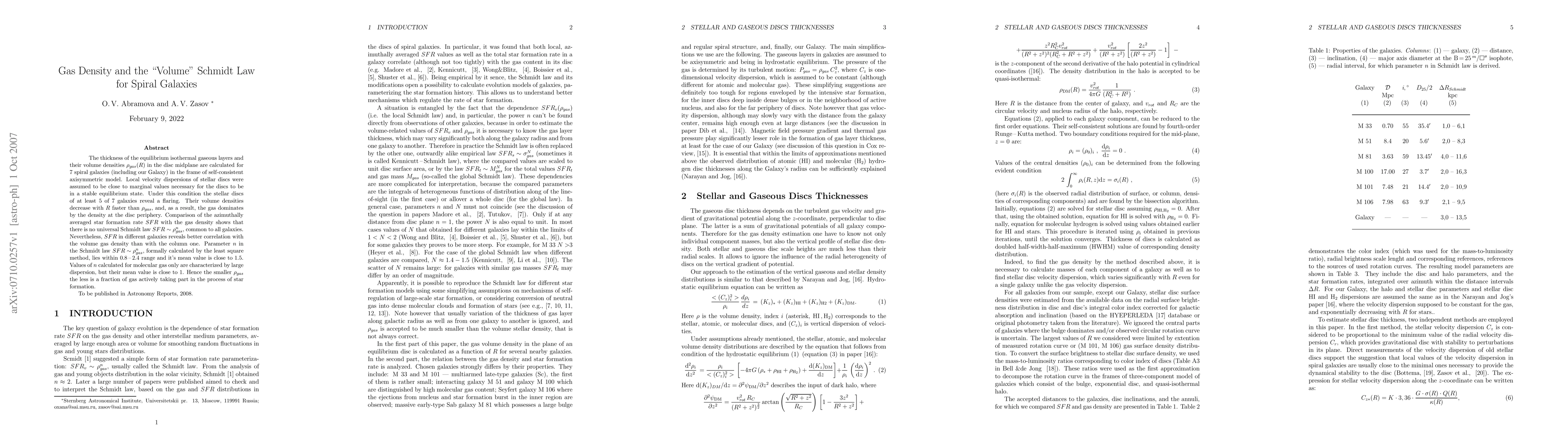 The thickness of the equilibrium isothermal gaseous layers and their volume densities \rho_{gas}(R) in the disc midplane are calculated for 7 spiral galaxies (including our Galaxy) in the frame of self-consistent axisymmetric model. Local velocity dispersions of stellar discs were assumed to be close to marginal values necessary for the discs to be in a stable equilibrium state. Under this condition the stellar discs of at least 5 of 7 galaxies reveal a flaring. Their volume densities decrease with R faster than \rho_{gas}, and, as a result, the gas dominates by the density at the disc periphery. Comparison of the azimuthally averaged star formation rate SFR with the gas density shows that there is no universal Schmidt law SFR \rho_{gas}^n, common to all galaxies. Nevertheless, SFR in different galaxies reveals better correlation with the volume gas density than with the column one. Parameter n in the Schmidt law SFR \rho_{gas}^n, formally calculated by the least square method, lies within 0.8-2.4 range and it's mean value is close to 1.5. Values of n calculated for molecular gas only are characterized by large dispersion, but their mean value is close to 1. Hence the smaller \rho_{gas} the less is a fraction of gas actively taking part in the process of star formation.