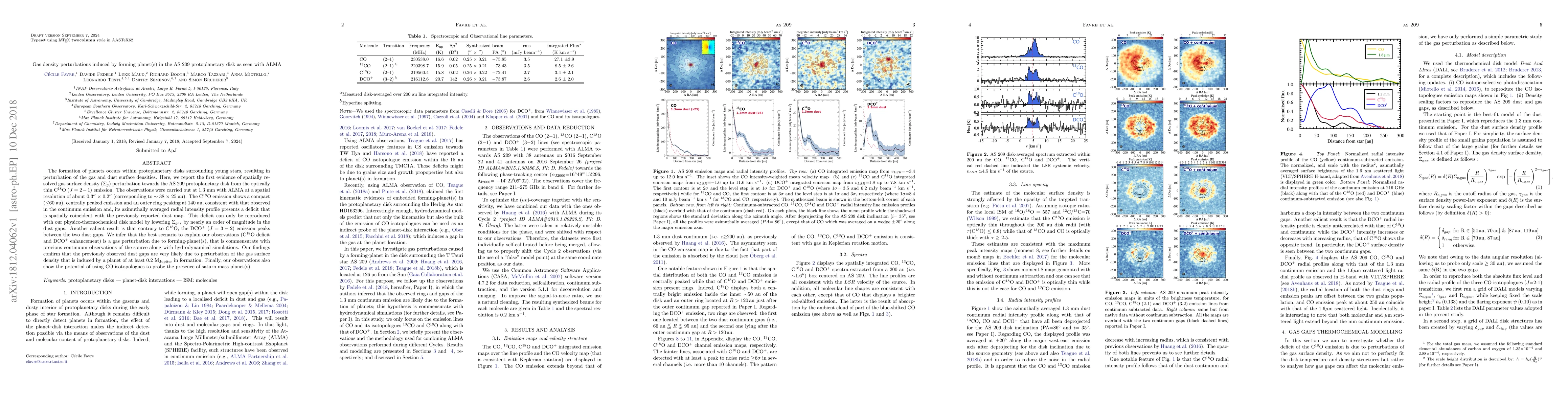 The formation of planets occurs within protoplanetary disks surrounding young stars, resulting in perturbation of the gas and dust surface densities. Here, we report the first evidence of spatially resolved gas surface density ($\Sigma_{g}$) perturbation towards the AS~209 protoplanetary disk from the optically thin C$^{18}$O ($J=2-1$) emission. The observations were carried out at 1.3~mm with ALMA at a spatial resolution of about 0.3$\arcsec$ $\times$ 0.2$\arcsec$ (corresponding to $\sim$ 38 $\times$ 25 au). The C$^{18}$O emission shows a compact ($\le$60~au), centrally peaked emission and an outer ring peaking at 140~au, consistent with that observed in the continuum emission and, its azimuthally averaged radial intensity profile presents a deficit that is spatially coincident with the previously reported dust map. This deficit can only be reproduced with our physico-thermochemical disk model by lowering $\Sigma_{gas}$ by nearly an order of magnitude in the dust gaps. Another salient result is that contrary to C$^{18}$O, the DCO$^{+}$ ($J=3-2$) emission peaks between the two dust gaps. We infer that the best scenario to explain our observations (C$^{18}$O deficit and DCO$^{+}$ enhancement) is a gas perturbation due to forming-planet(s), that is commensurate with previous continuum observations of the source along with hydrodynamical simulations. Our findings confirm that the previously observed dust gaps are very likely due to perturbation of the gas surface density that is induced by a planet of at least 0.2~M$\rm_{Jupiter}$ in formation. Finally, our observations also show the potential of using CO isotopologues to probe the presence of saturn mass planet(s).