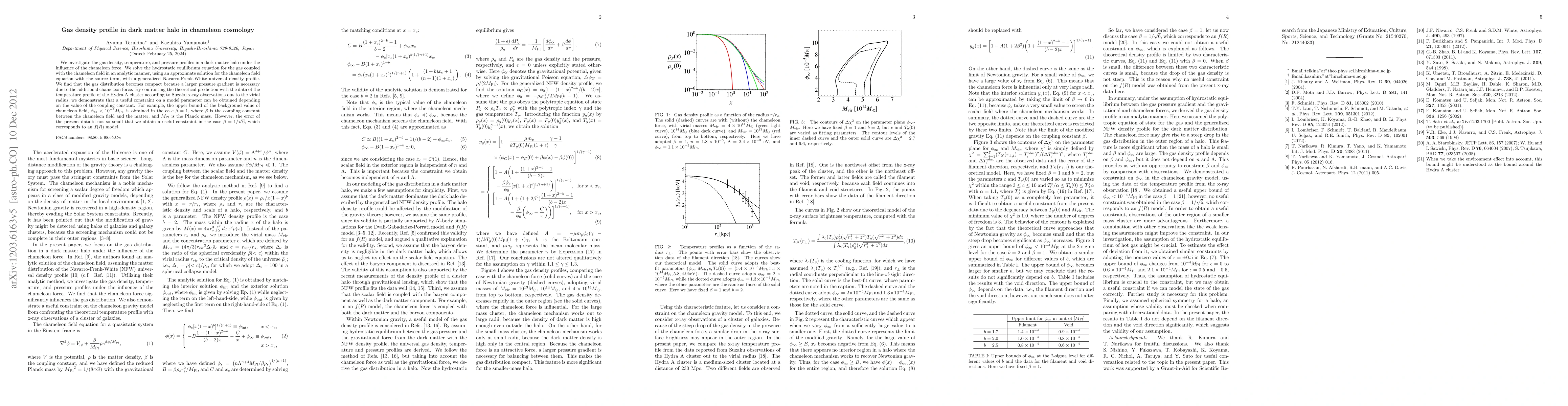 Researchers investigated gas density profiles in dark matter halos under chameleon cosmology, finding compact distribution due to additional pressure gradient; they obtained constraints on a model parameter using data from the Hydra A cluster.