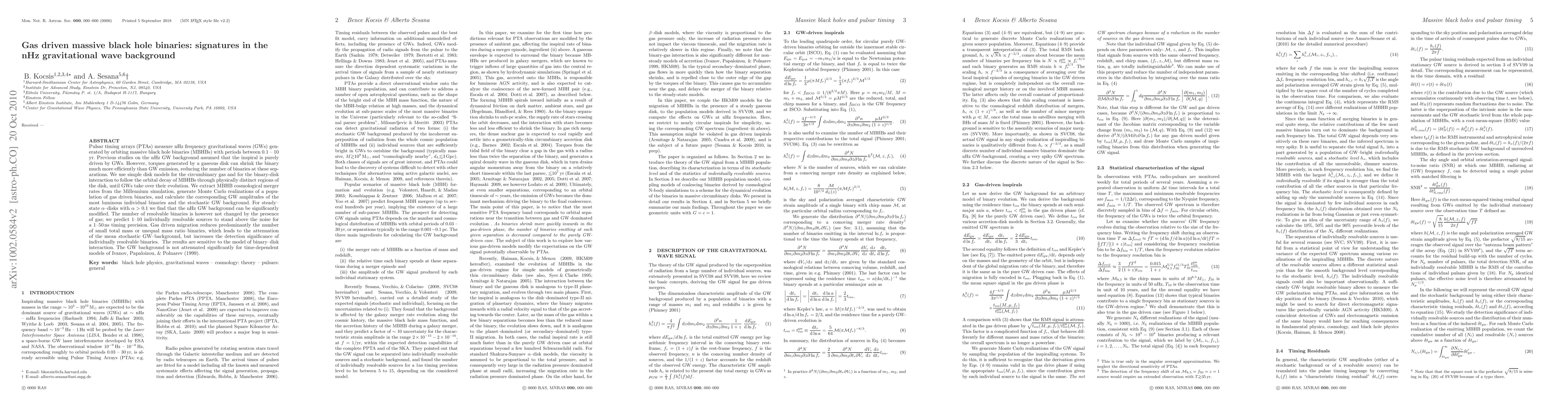Pulsar timing arrays (PTAs) measure nHz frequency gravitational waves (GWs) generated by orbiting massive black hole binaries (MBHBs) with periods between 0.1-10 yr. Previous studies on the nHz GW background assumed that the inspiral is purely driven by GWs. However, torques generated by a gaseous disk can shrink the binary much more efficiently than GW emission, reducing the number of binaries at these separations. We use simple disk models for the circumbinary gas and for the binary-disk interaction to follow the orbital decay of MBHBs through physically distinct regions of the disk, until GWs take over their evolution. We extract MBHB cosmological merger rates from the Millennium simulation, generate Monte Carlo realizations of a population of gas driven binaries, and calculate the corresponding GW amplitudes of the most luminous individual binaries and the stochastic GW background. For steady state alpha-disks with alpha>0.1 we find that the nHz GW background can be significantly modified. The number of resolvable binaries is however not changed by the presence of gas; we predict 1-10 individually resolvable sources to stand above the noise for a 1-50 ns timing precision. Gas driven migration reduces predominantly the number of small total mass or unequal mass ratio binaries, which leads to the attenuation of the mean stochastic GW--background, but increases the detection significance of individually resolvable binaries. The results are sensitive to the model of binary--disk interaction. The GW background is not attenuated significantly for time-dependent models of Ivanov, Papaloizou, & Polnarev (1999).