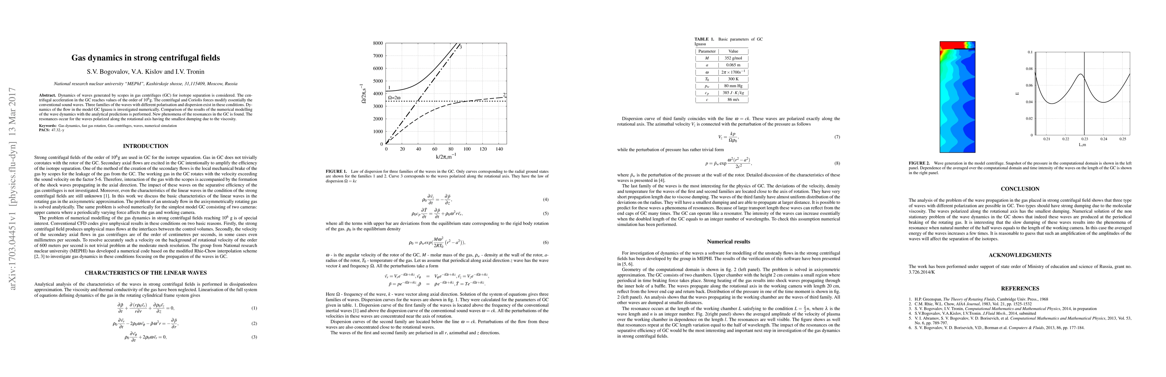 The research employs analytical analysis in dissipationless approximation, neglecting viscosity and thermal conductivity of the gas. It also uses numerical modeling with a modified Rhie-Chow interpolation scheme to investigate gas dynamics in strong centrifugal fields, focusing on wave propagation in gas centrifuges.