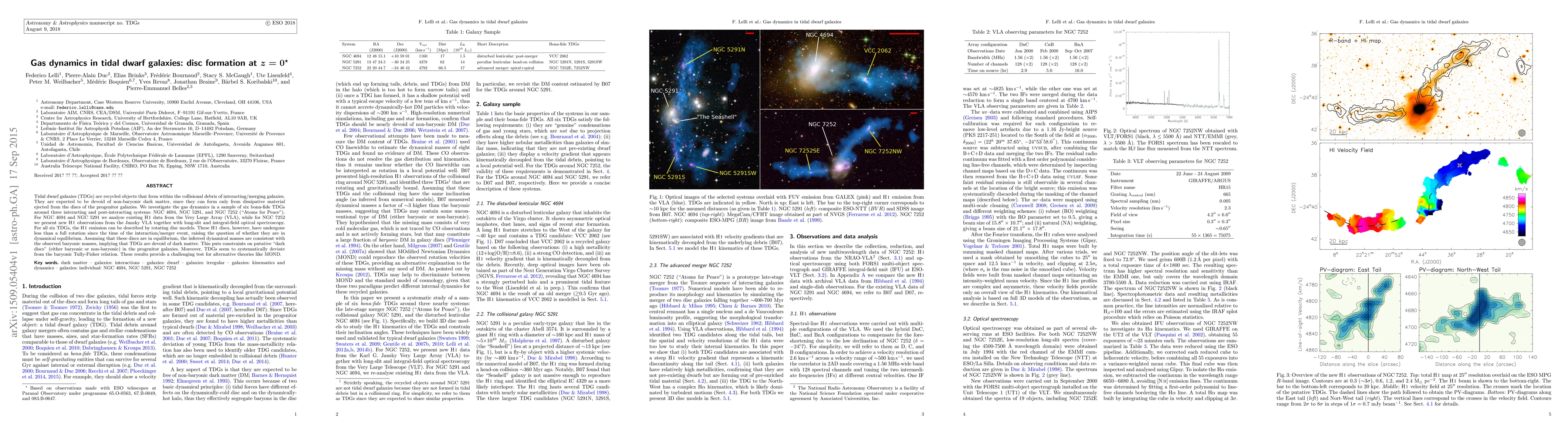 Tidal dwarf galaxies (TDGs) are recycled objects that form within the collisional debris of interacting/merging galaxies. They are expected to be devoid of non-baryonic dark matter, since they can form only from dissipative material ejected from the discs of the progenitor galaxies. We investigate the gas dynamics in a sample of six bona-fide TDGs around three interacting and post-interacting systems: NGC 4694, NGC 5291, and NGC 7252 ("Atoms for Peace"). For NGC 4694 and NGC 5291 we analyse existing HI data from the Very Large Array (VLA), while for NGC 7252 we present new HI observations from the Jansky VLA together with long-slit and integral-field optical spectroscopy. For all six TDGs, the HI emission can be described by rotating disc models. These HI discs, however, have undergone less than a full rotation since the time of the interaction/merger event, raising the question of whether they are in dynamical equilibrium. Assuming that these discs are in equilibrium, the inferred dynamical masses are consistent with the observed baryonic masses, implying that TDGs are devoid of dark matter. This puts constraints on putative "dark discs" (either baryonic or non-baryonic) in the progenitor galaxies. Moreover, TDGs seem to systematically deviate from the baryonic Tully-Fisher relation. These results provide a challenging test for alternative theories like MOND.
