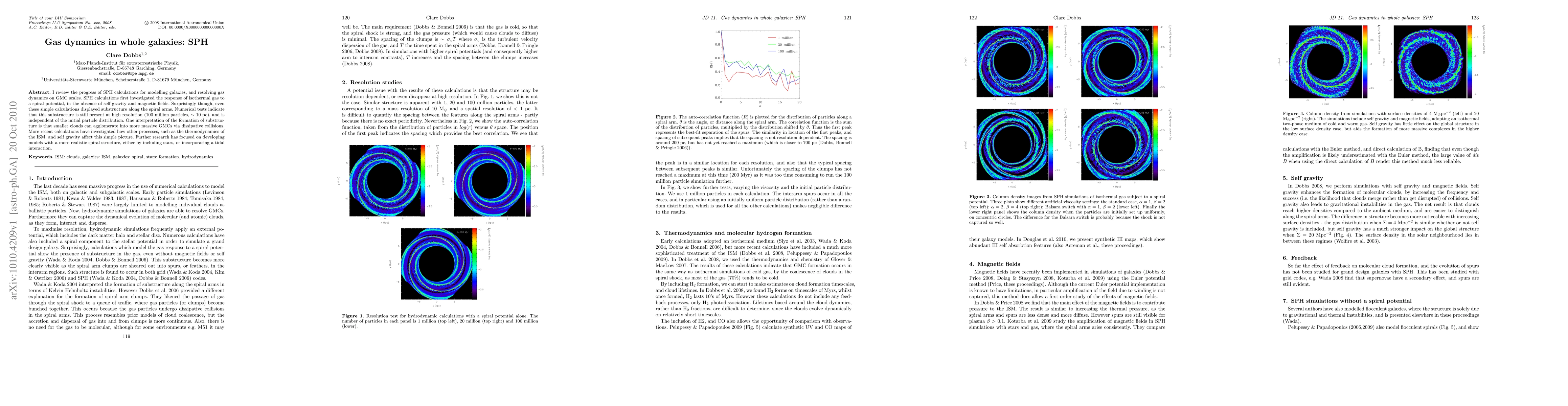 I review the progress of SPH calculations for modelling galaxies, and resolving gas dynamics on GMC scales. SPH calculations first investigated the response of isothermal gas to a spiral potential, in the absence of self gravity and magnetic fields. Surprisingly though, even these simple calculations displayed substructure along the spiral arms. Numerical tests indicate that this substructure is still present at high resolution (100 million particles, ~10 pc), and is independent of the initial particle distribution. One interpretation of the formation of substructure is that smaller clouds can agglomerate into more massive GMCs via dissipative collisions. More recent calculations have investigated how other processes, such as the thermodynamics of the ISM, and self gravity affect this simple picture. Further research has focused on developing models with a more realistic spiral structure, either by including stars, or incorporating a tidal interaction.