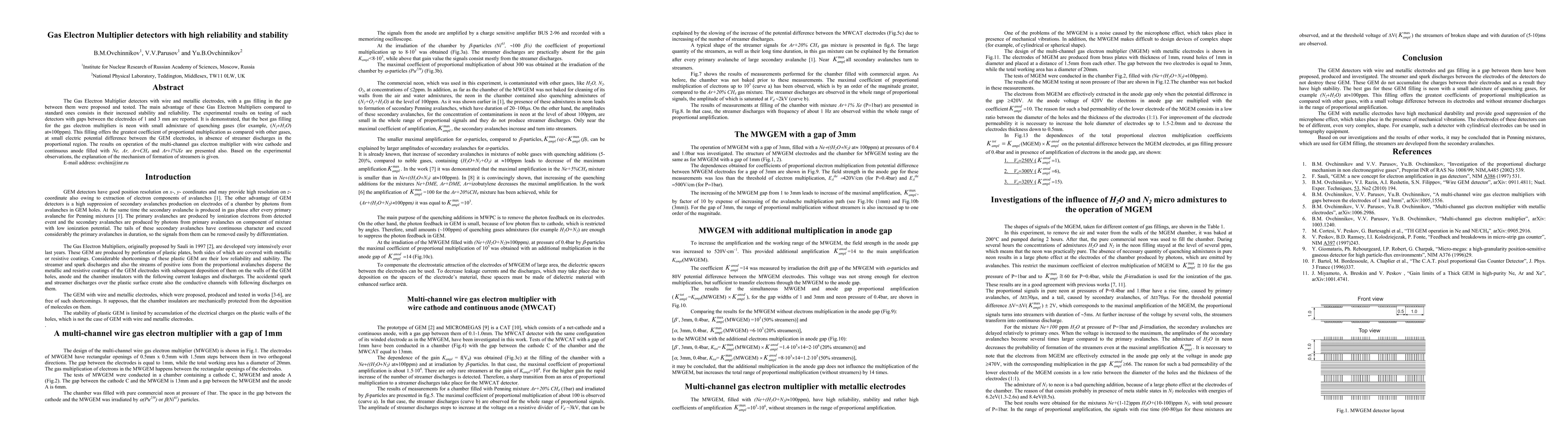 The Gas Electron Multiplier detectors with wire and metallic electrodes, with a gas filling in the gap between them were proposed and tested. The main advantage of these Gas Electron Multipliers compared to standard ones consists in their increased stability and reliability. The experimental results on testing of such detectors with gaps between the electrodes of 1 and 3 mm are reported. It is demonstrated, that the best gas filling for the gas electron multipliers is neon with small admixture of quenching gases (for example, (N2+H2O) at ~100ppm). This filling offers the greatest coefficient of proportional multiplication as compared with other gases, at small electric potential difference between the GEM electrodes, in absence of streamer discharges in the proportional region. The results on operation of the multi-channel gas electron multiplier with wire cathode and continuous anode filled with Ne, Ar, Ar+CH4 and Ar+1%Xe are presented also. Based on the experimental observations, the explanation of the mechanism of formation of streamers is given.