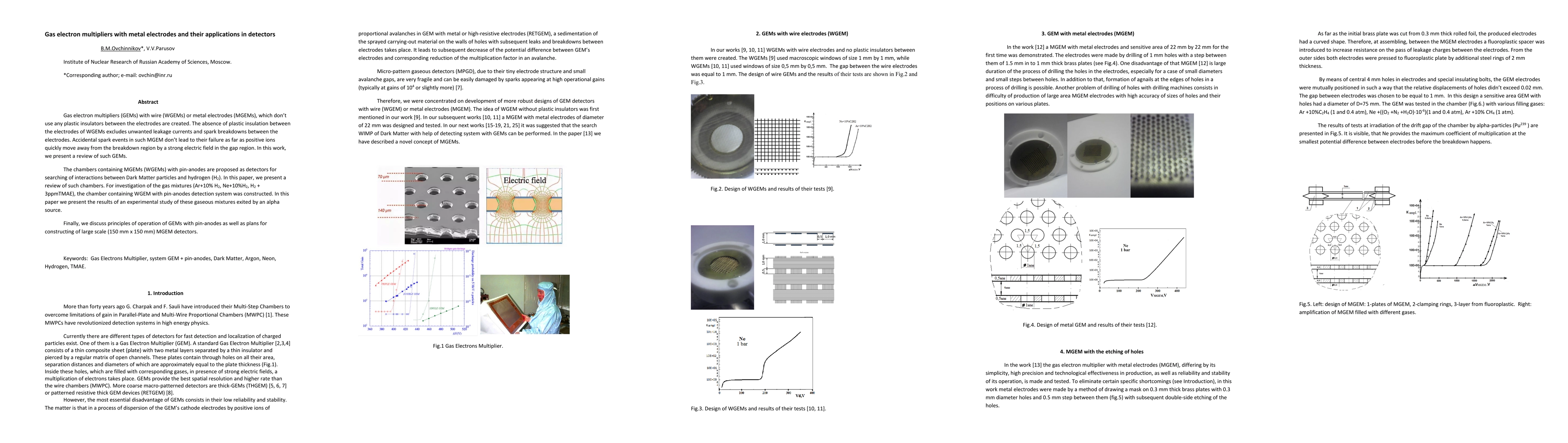 Gas electron multipliers (GEMs) with wire (WGEMs) or metal electrodes (MGEMs), which don't use any plastic insulators between the electrodes are created. The absence of plastic insulation between the electrodes of WGEMs excludes unwanted leakage currents and spark breakdowns between the electrodes. Accidental spark events in such MGEM don't lead to their failure as far as positive ions quickly move away from the breakdown region by a strong electric field in the gap region. In this work, we present a review of such GEMs. The chambers containing MGEMs (WGEMs) with pin-anodes are proposed as detectors for searching of interactions between Dark Matter particles and hydrogen (H2). In this paper, we present a review of such chambers. For investigation of the gas mixtures (Ar+10% H2, Ne+10%H2, H2 +3ppmTMAE), the chamber containing WGEM with pin-anodes detection system was constructed. In this paper we present the results of an experimental study of these gaseous mixtures exited by an alpha source. Finally, we discuss principles of operation of GEMs with pin-anodes as well as plans for constructing of large scale (150 mm x 150 mm) MGEM detectors.