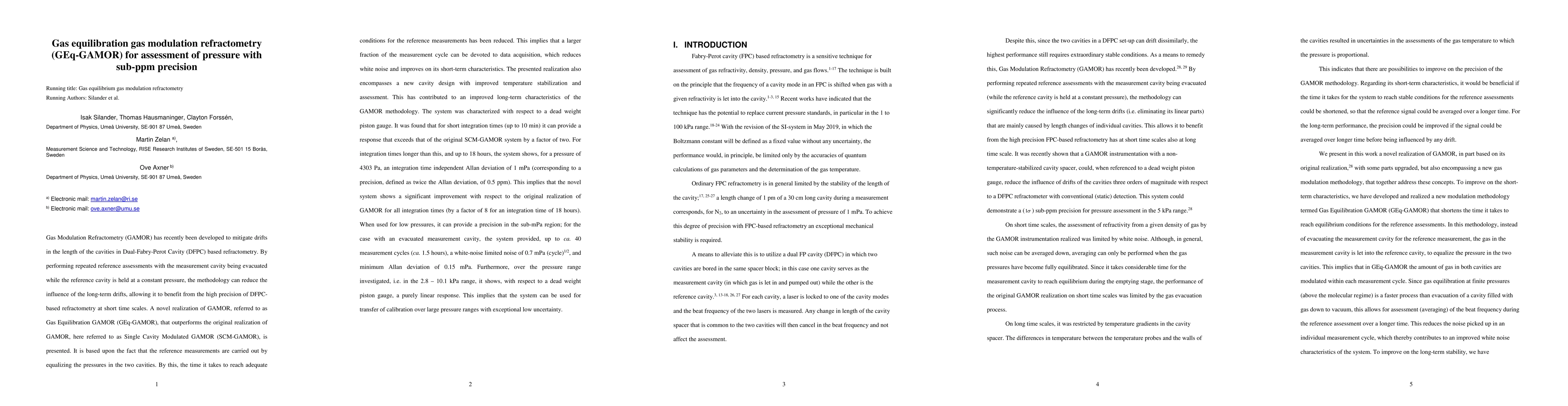A novel realization of Gas Modulation Refractometry (GAMOR) that outperforms the original realization [Single Cavity Modulated GAMOR (SCM-GAMOR)], is presented. The reference measurements are carried out by equalizing the pressures in the two cavities. By this, the time it takes to reach adequate conditions for the reference measurements has been reduced. This implies that a larger fraction of the measurement cycle can be devoted to data acquisition, which reduces white noise and improves on short-term characteristics. The presented realization also encompasses a new cavity design with improved temperature stabilization and assessment. This has contributed to an improved long-term characteristics. The system was characterized with respect to a dead weight piston gauge. For short integration times (up to 10 min) it can provide a response that exceeds that of the original SCM-GAMOR system by a factor of two. For longer integration times, and up to 18 hours, the system shows, at 4303 Pa, an integration time independent Allan deviation of 1 mPa (corresponding to a precision defined as twice the Allan deviation, of 0.5 ppm). This implies that the novel system shows a significant improvement with respect to the original realization for all integration times (by a factor of 8 for an integration time of 18 hours). When used for low pressures, it can provide a precision in the sub-mPa region; for the case with an evacuated measurement cavity, the system provided, up to ca. 40 measurement cycles (ca. 1.5 hours), a white-noise limited noise of 0.7 mPa sqrt(cycle), and minimum Allan deviation of 0.15 mPa. Furthermore, over the pressure range investigated, i.e. in the 2.8 - 10.1 kPa range, it shows, with respect to a dead weight piston gauge, a purely linear response. This implies that the system can be used for transfer of calibration over large pressure ranges with exceptional low uncertainty.