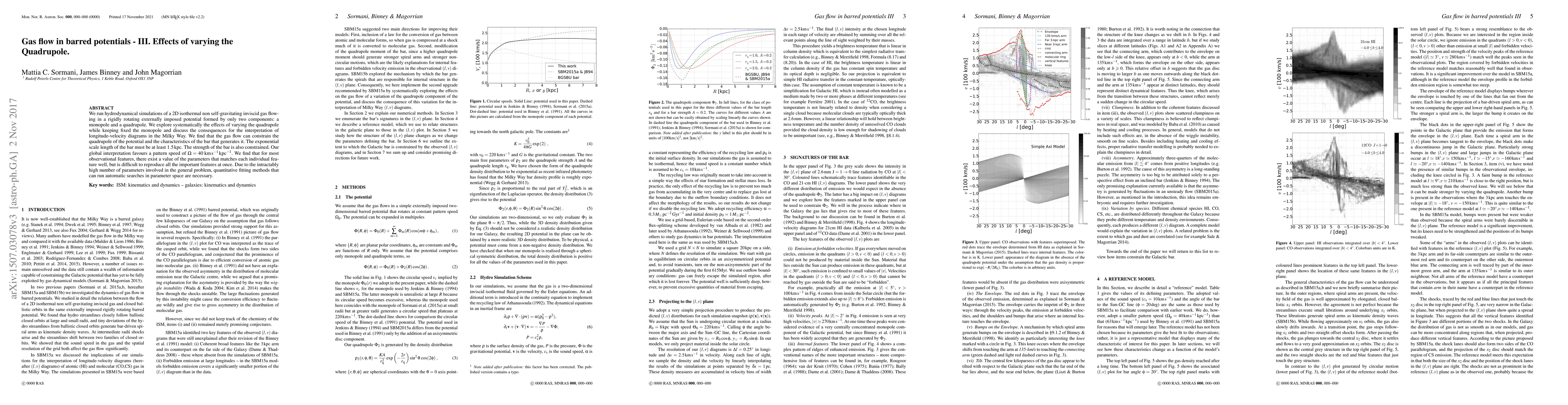 We run hydrodynamical simulations of a 2D isothermal non self-gravitating inviscid gas flowing in a rigidly rotating externally imposed potential formed by only two components: a monopole and a quadrupole. We explore systematically the effects of varying the quadrupole while keeping fixed the monopole and discuss the consequences for the interpretation of longitude-velocity diagrams in the Milky Way. We find that the gas flow can constrain the quadrupole of the potential and the characteristics of the bar that generates it. The exponential scale length of the bar must be at least $1.5\rm\, kpc$. The strength of the bar is also constrained. Our global interpretation favours a pattern speed of $\Omega=40\,\rm km s^{-1} {kpc}^{-1}$. We find that for most observational features, there exist a value of the parameters that matches each individual feature well, but is difficult to reproduce all the important features at once. Due to the intractably high number of parameters involved in the general problem, quantitative fitting methods that can run automatic searches in parameter space are necessary.